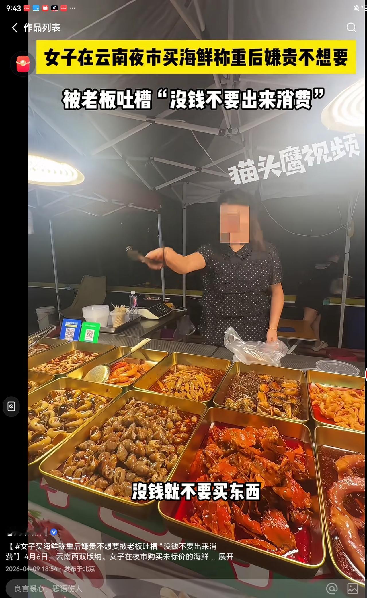 这下把摊主惹毛了,说不买就别想走,以后有钱就买,没钱别出来消费,不仅如此,还拿着蘸满料汁的勺子弄海鲜料汁扬这两位女生。本来先称重后说价格就不合理,没想到云南西双版纳的摊贩如此穷横,做个生意跟抢钱似的,云南文旅不好好管管,真变成一颗老鼠屎坏了一锅粥了