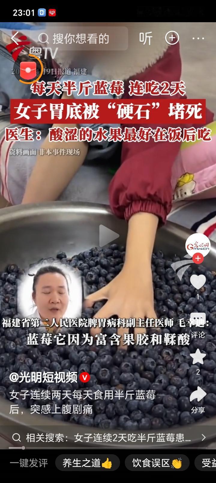 福建一名女子连续两天空腹每天吃半斤蓝莓后,突发上腹剧痛并伴恶心反酸,就医后发现胃