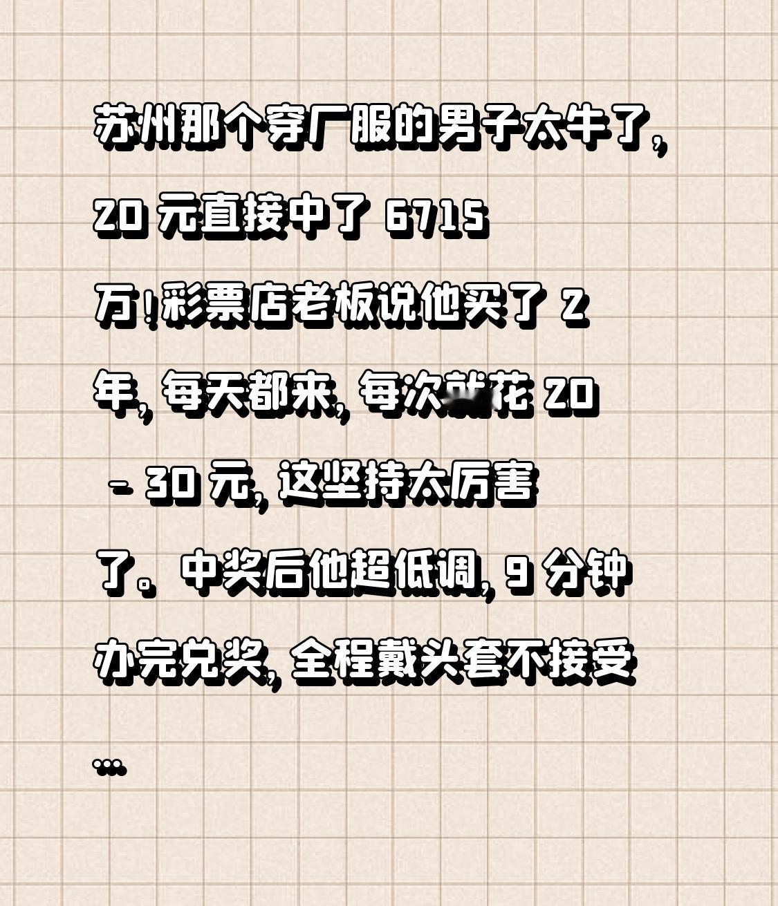 苏州那个穿厂服的男子太牛了,20 元直接中了 6715 万!彩票店老板说他买了 2 年,每天都来,每次就花 20 - 30 元,这坚持太厉害了。