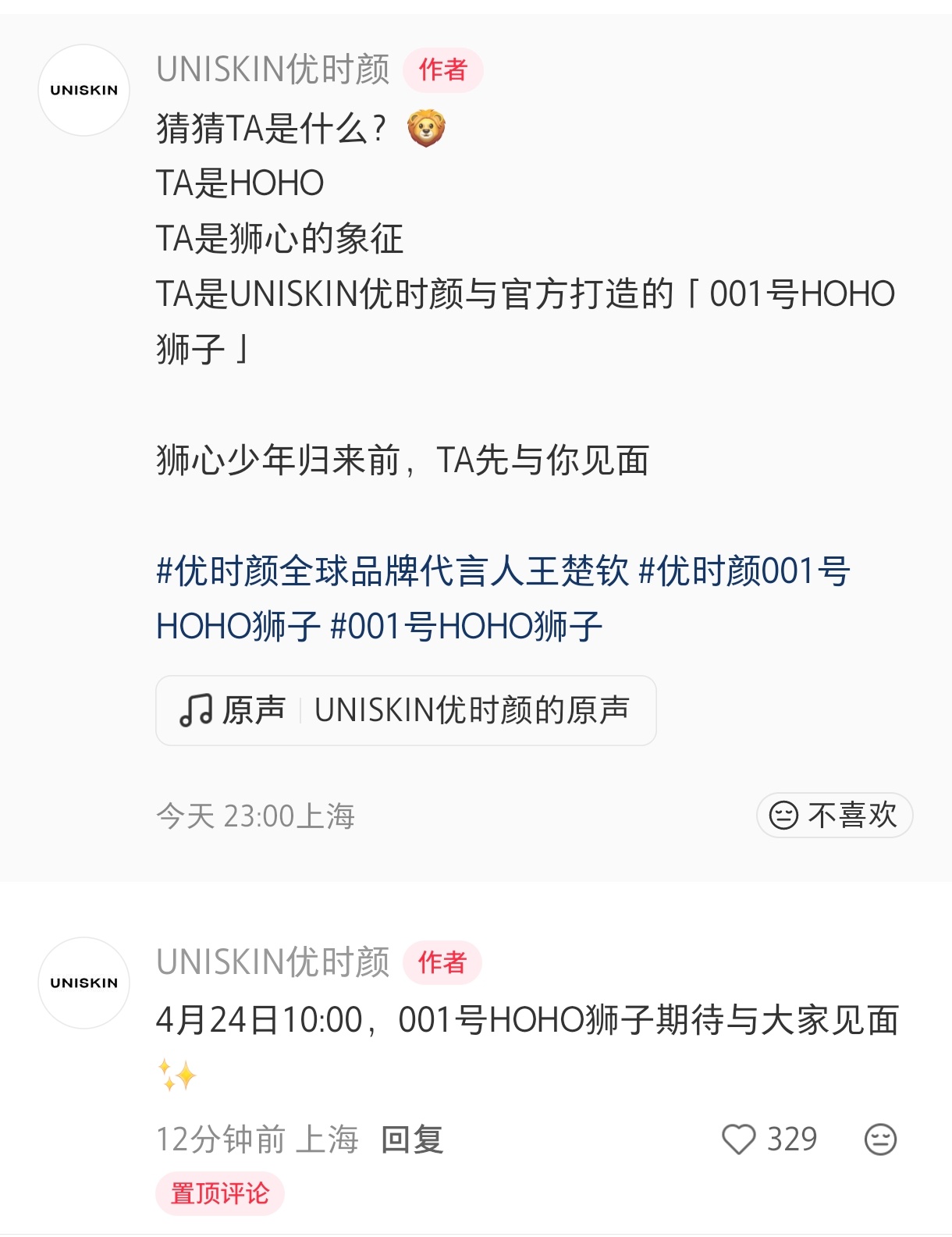 王HOHO王楚钦 🦁001号HOHO狮子 🦁狮塑大胜利!!我们楚钦完全是genius这是楚钦设计的小狮子HOHO哟,燥候🔥4/14清扬 4/22舒肤佳 4/24优时颜 期待HOHO宝宝优时颜全球品牌代言人王楚钦🦁优时颜001号HOHO狮子🦁舒肤佳品牌全线代言人王楚钦