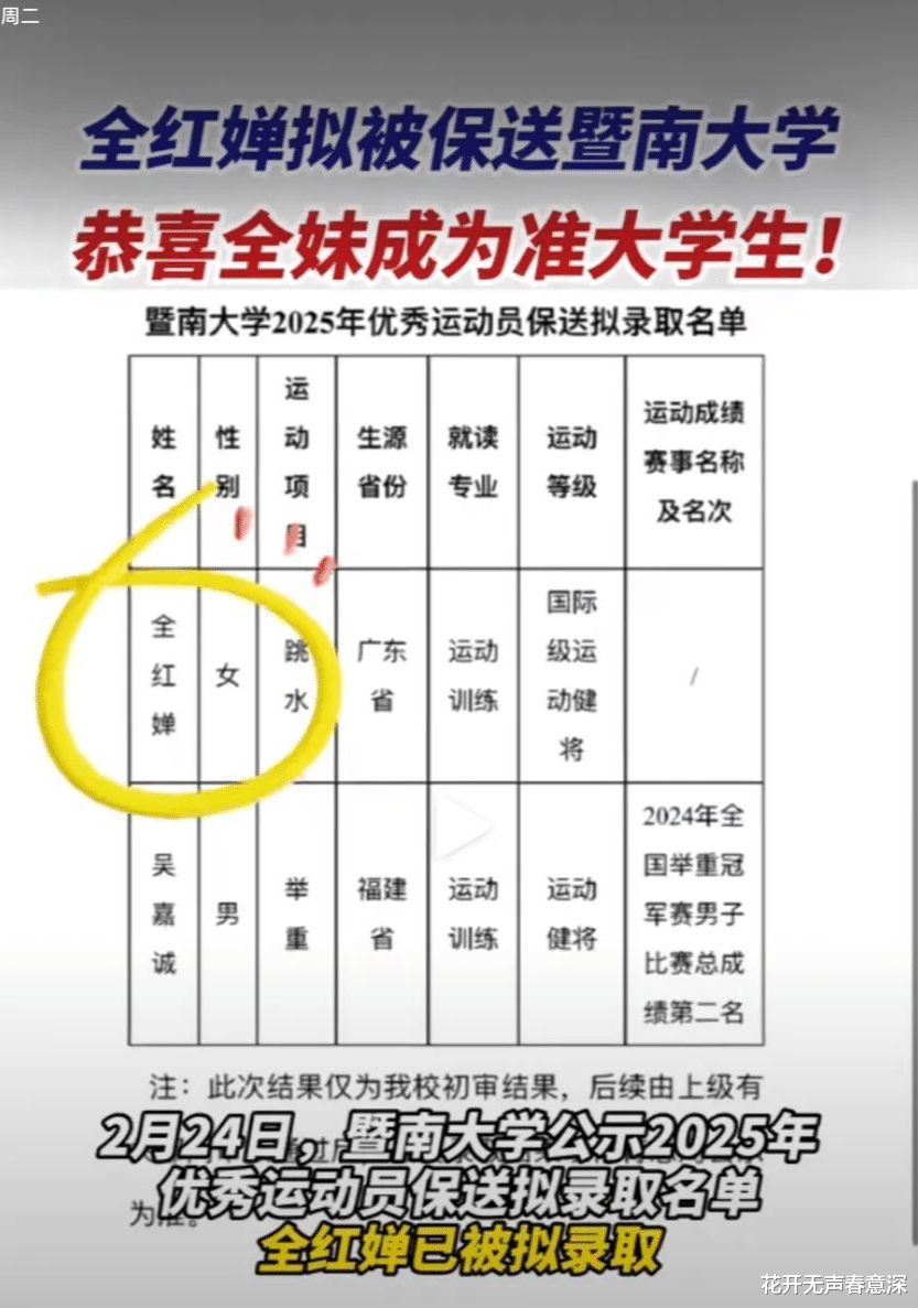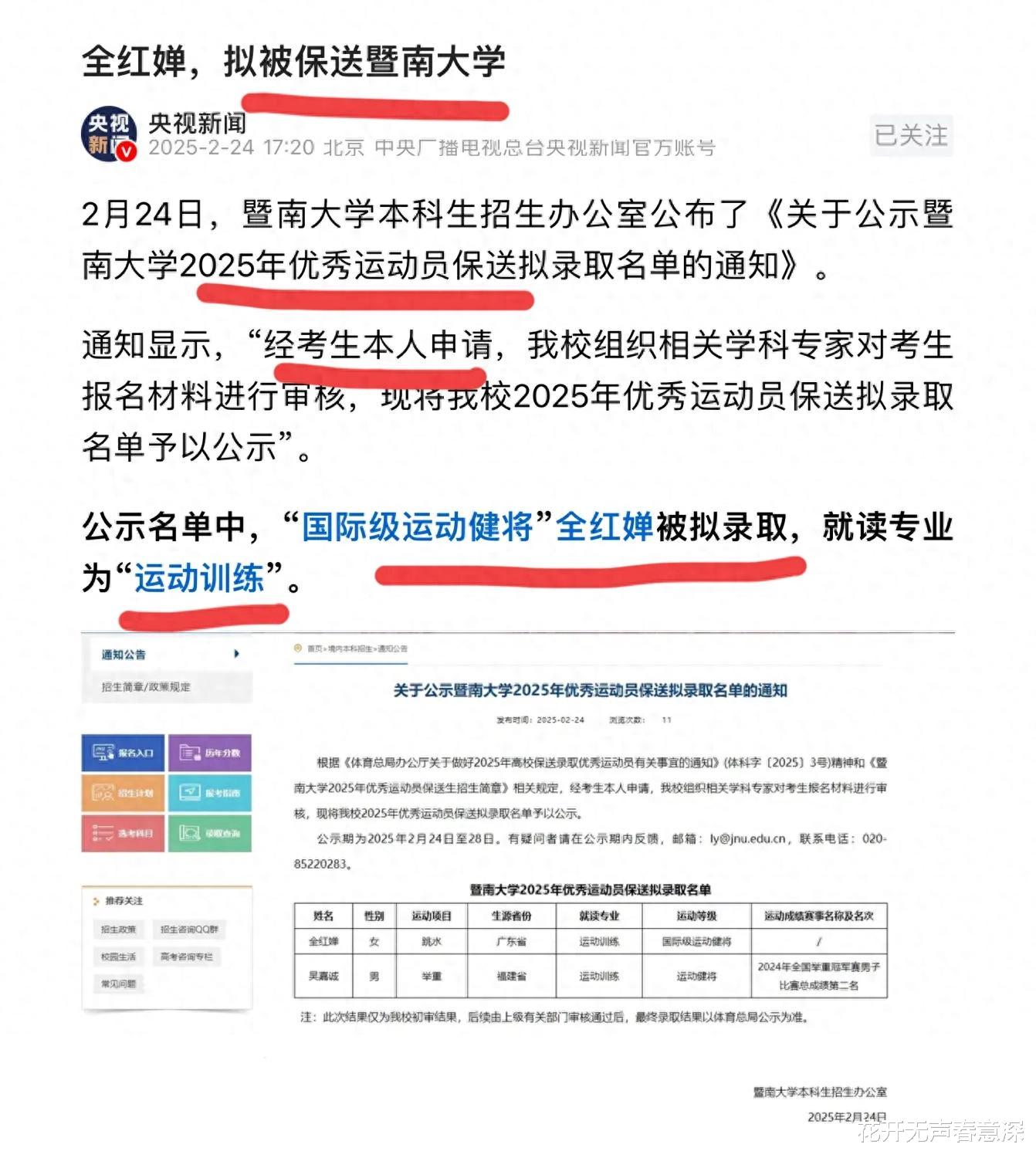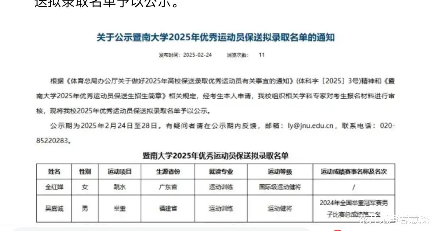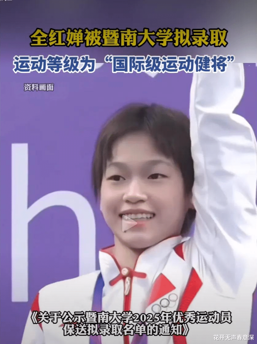 2月23号,央视新闻和人民日报等官方媒体报道了全红婵即将会被保送了广东的暨南大学,很快就会成为一名真正意义的大学生。尤其值得注意的是,这次去暨南大学在通告里面明确写到是经过全红婵本人亲自申请的,申请的资格是“国际级运动健将”,去年全红婵国家队队友选择的是上海的同济大学。