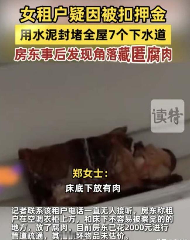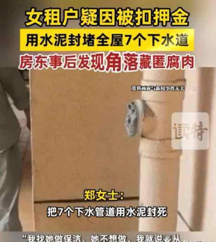互相伤害?河南郑州,一对夫妻把房子租给一名女孩,房子到期退租后,夫妻俩要求女孩打扫房间,被拒绝后便要从押金里扣,没成想,女孩突然急了,直接把下水道全用水泥封死,来了一波两败俱伤。