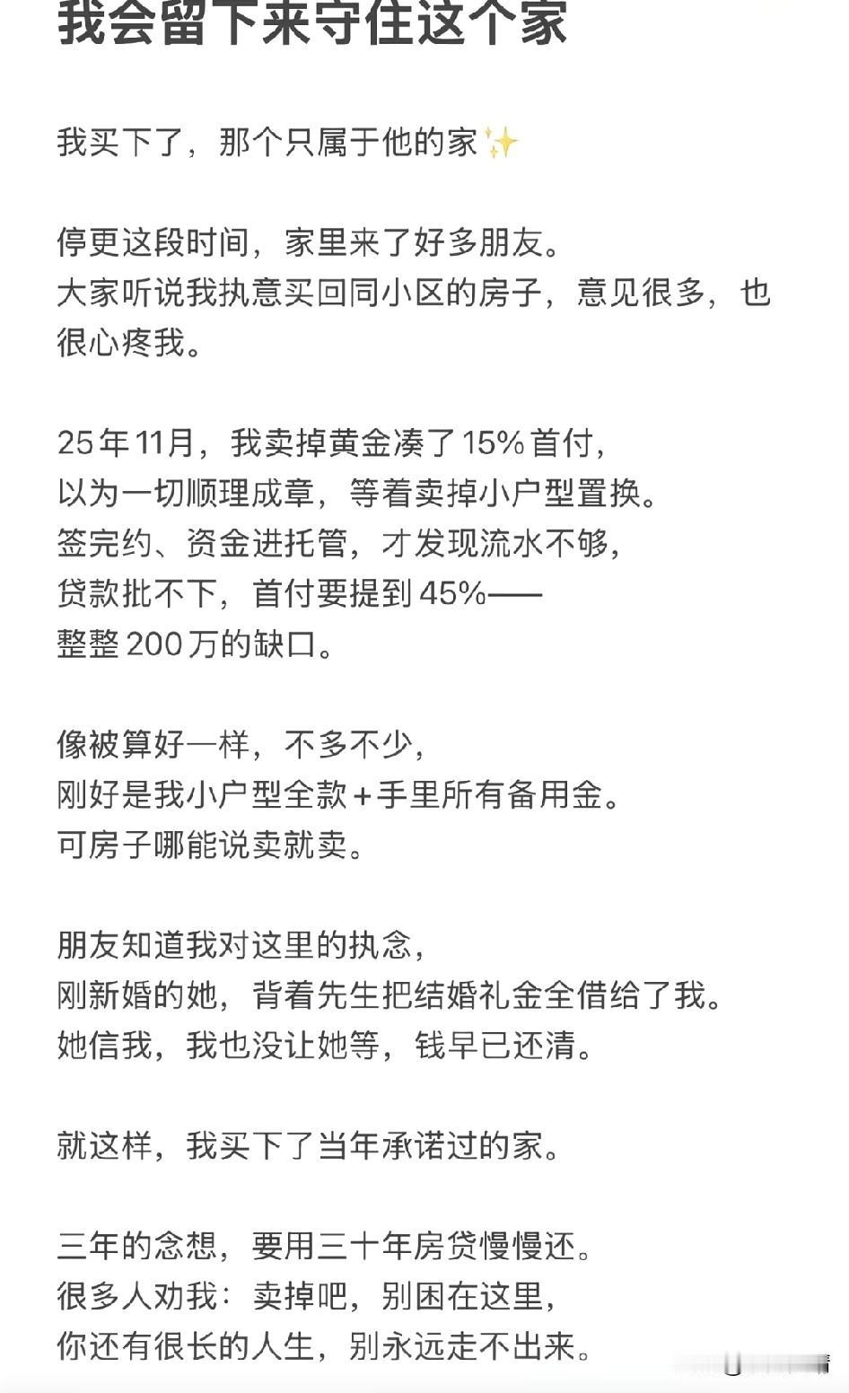 可就算凑齐了首付,剩余的房款还是让她压力倍增,最终她咬了咬牙,签下了30年的房贷合同,她说自己从来没后悔过这个决定,甚至直言“三年的念想,要用三十年房贷慢慢还”。