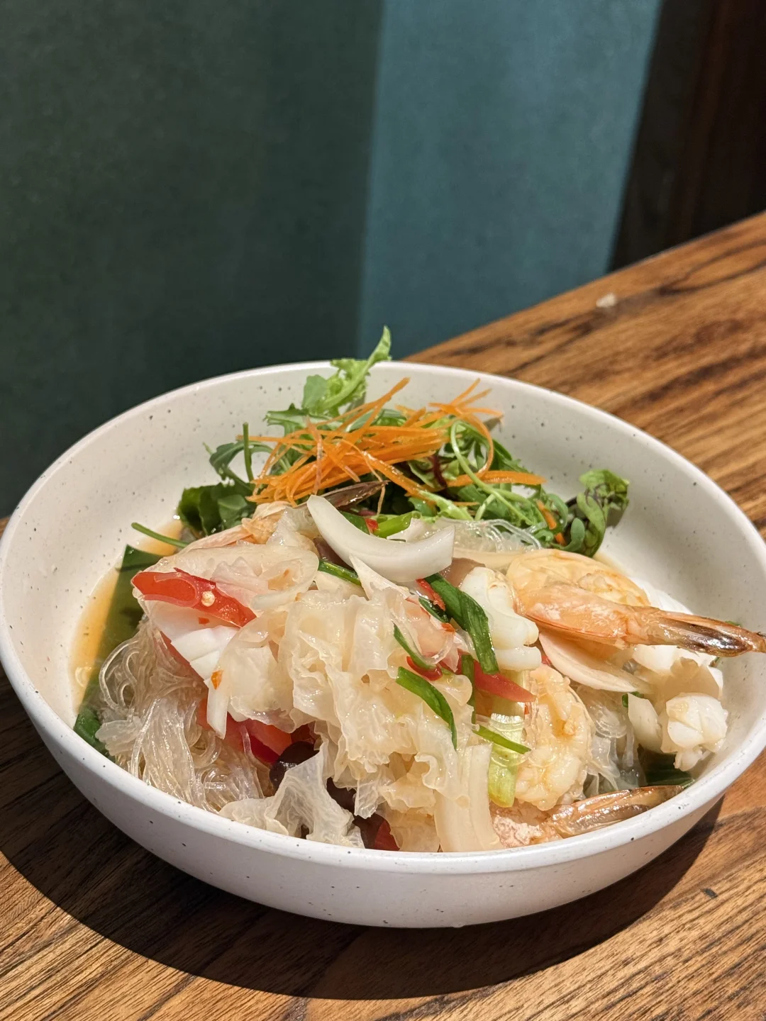 这道我也很喜欢!是那种酸辣开胃型的海鲜凉拌粉丝,整体口感很清爽,海鲜配上粉丝很顺口,放在整桌偏重口味的菜里面,刚好可以中和一下 很适合先吃,直接把胃口打开。