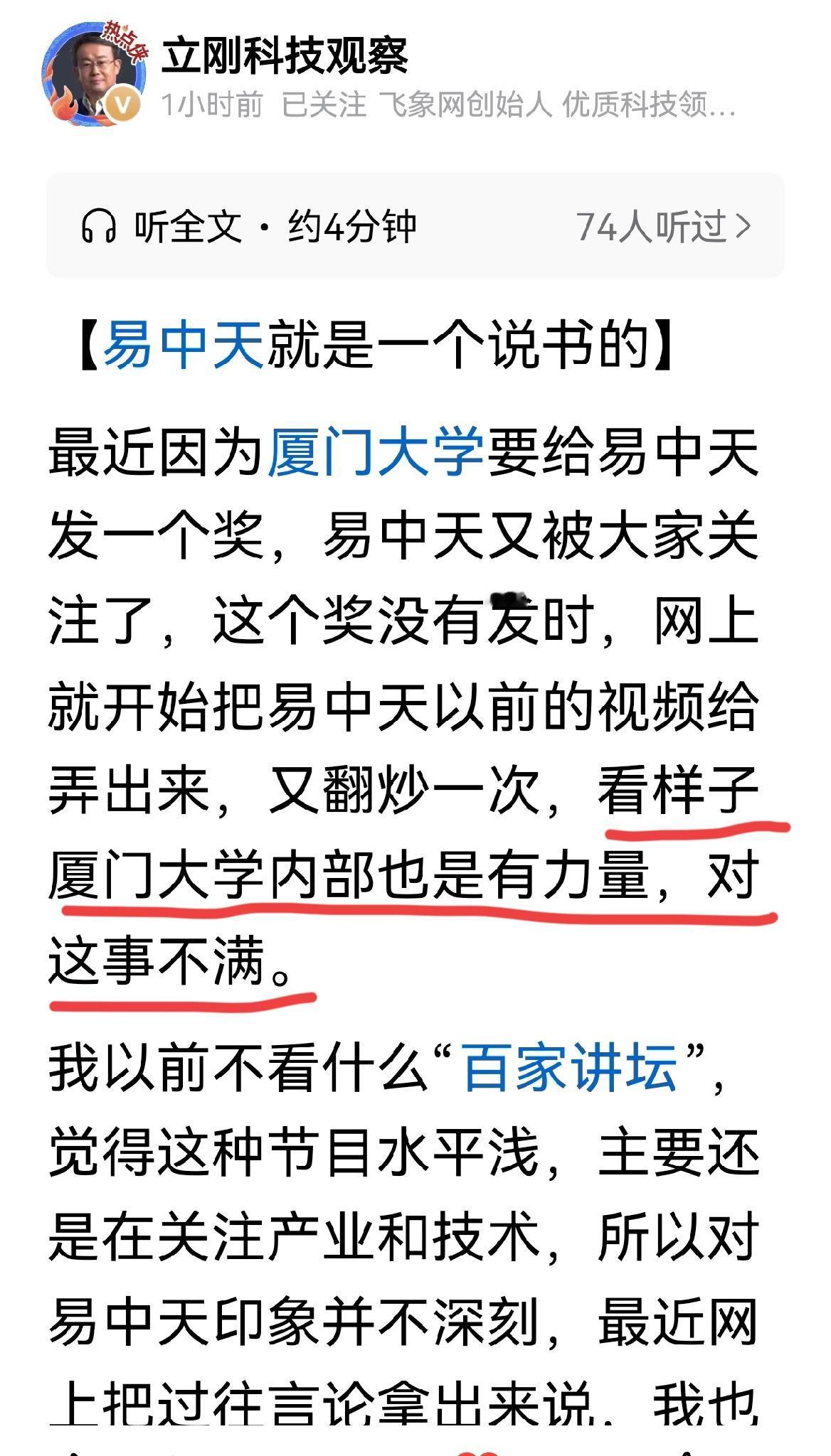 想想看,这个“杰出贡献奖”是每年颁发一次,易中天获这个奖是2025年度的,他这一年到底为厦大做了什么?去年他已经搬到苏州去住了,一年不怎么去厦大上班,挂一个虚职院长,这一年怎么做出的贡献?而许多厦大的教师都是起早贪黑,眼睛一睁忙到熄灯的搞教学,而一个过气的网红教授却获得了奖,你说大部分教职工服气不服气。