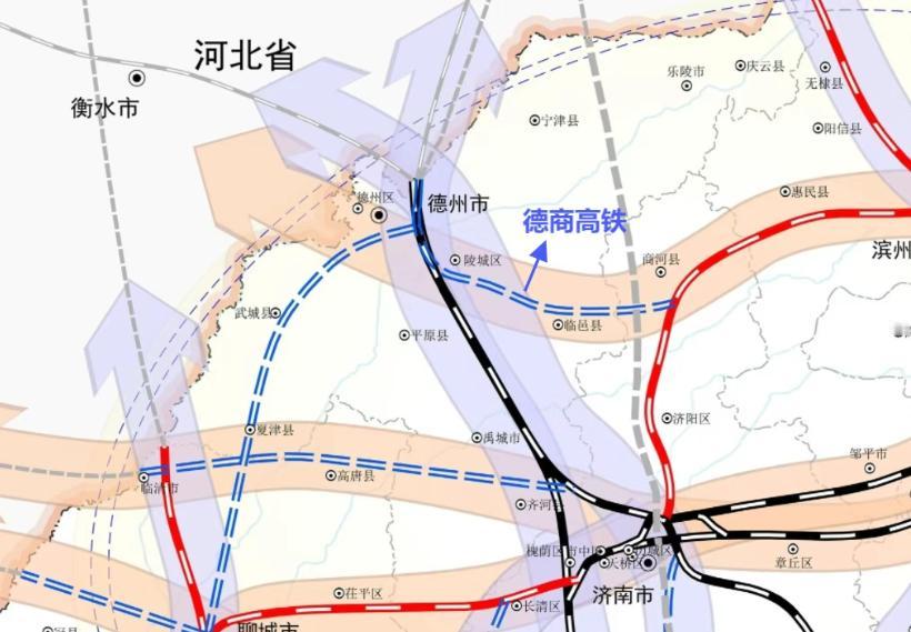德州至商河高铁 (德商高铁):德商高铁是济南“省会高铁环”的重要组成部分,旨在闭合省会高铁环线,形成济南辐射周边的环形高铁网络,加强济南都市圈内部的互联互通。