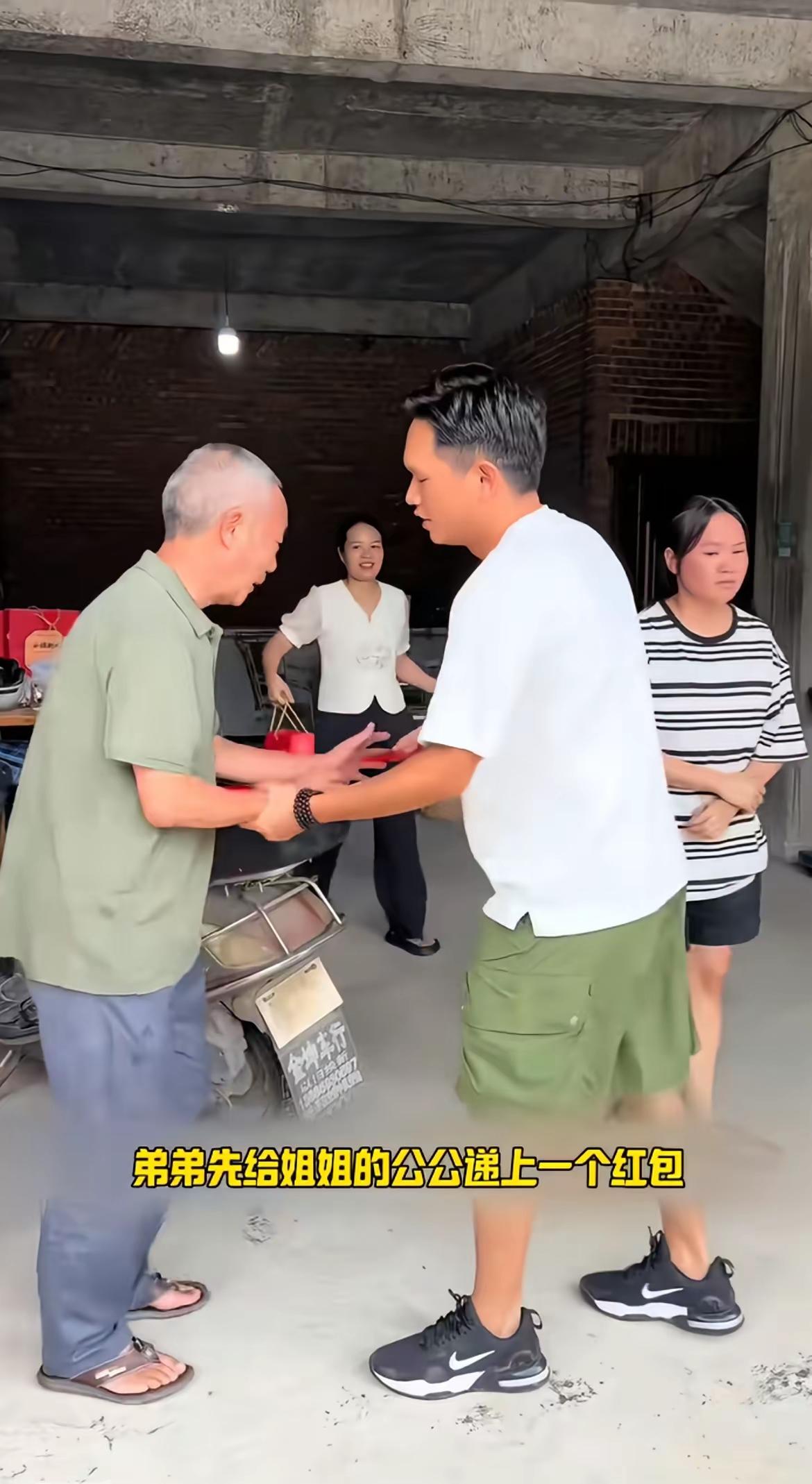 他先是拿出一个红包,双手递给姐姐的公公,语气格外恭敬。