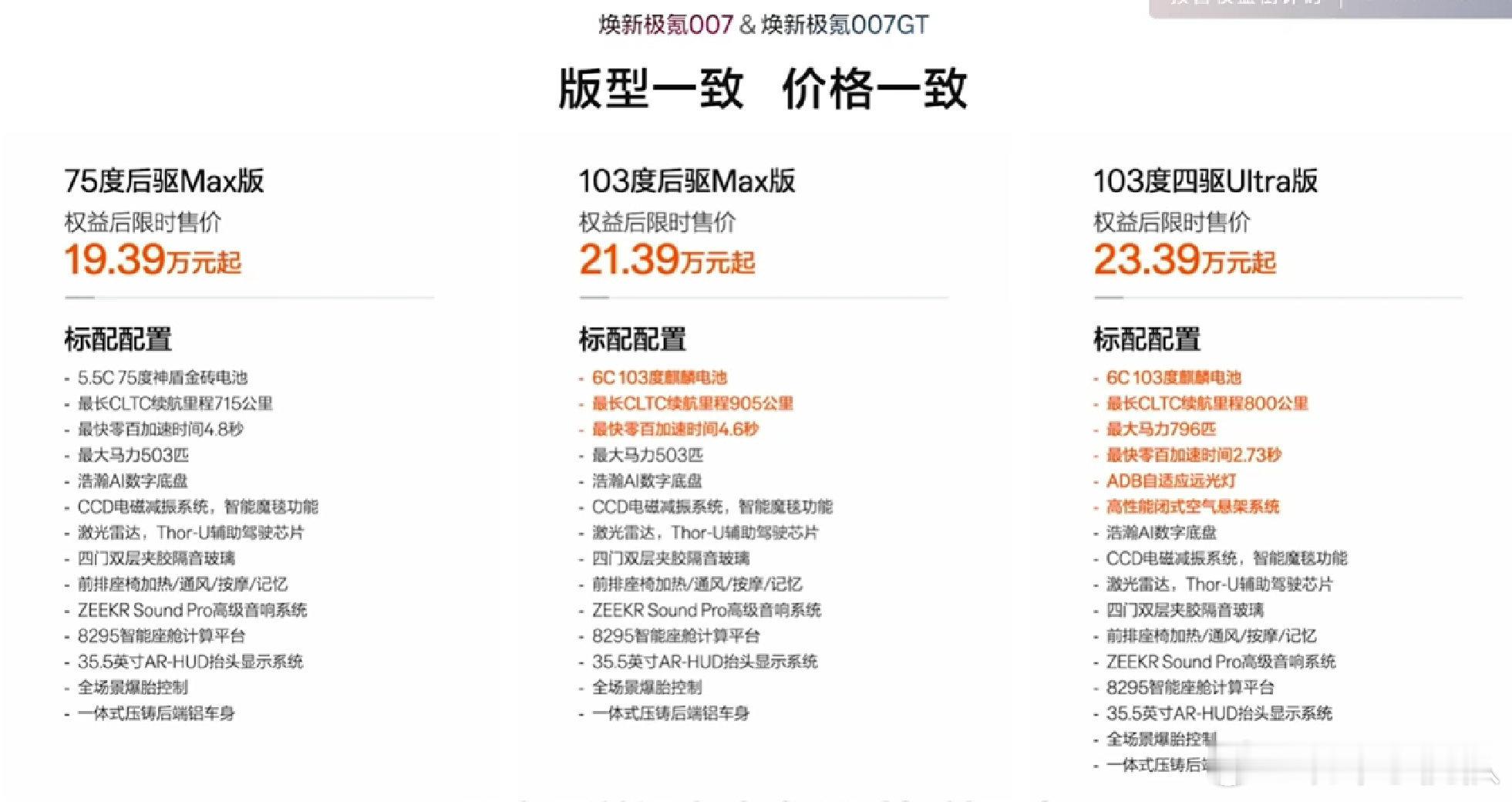 19.39万起!走的福满多的路线,加量不加价而且老车主置换,送5年免费充电这挺香的。这次车型的升级,在我看来核心还是 要更好开,更能跑,更有姿态。且优化了老车主在意的离地间隙147mm 这次下地库踏实了吧?一秒看透极氪安全黑科技极氪更强7系更强GT