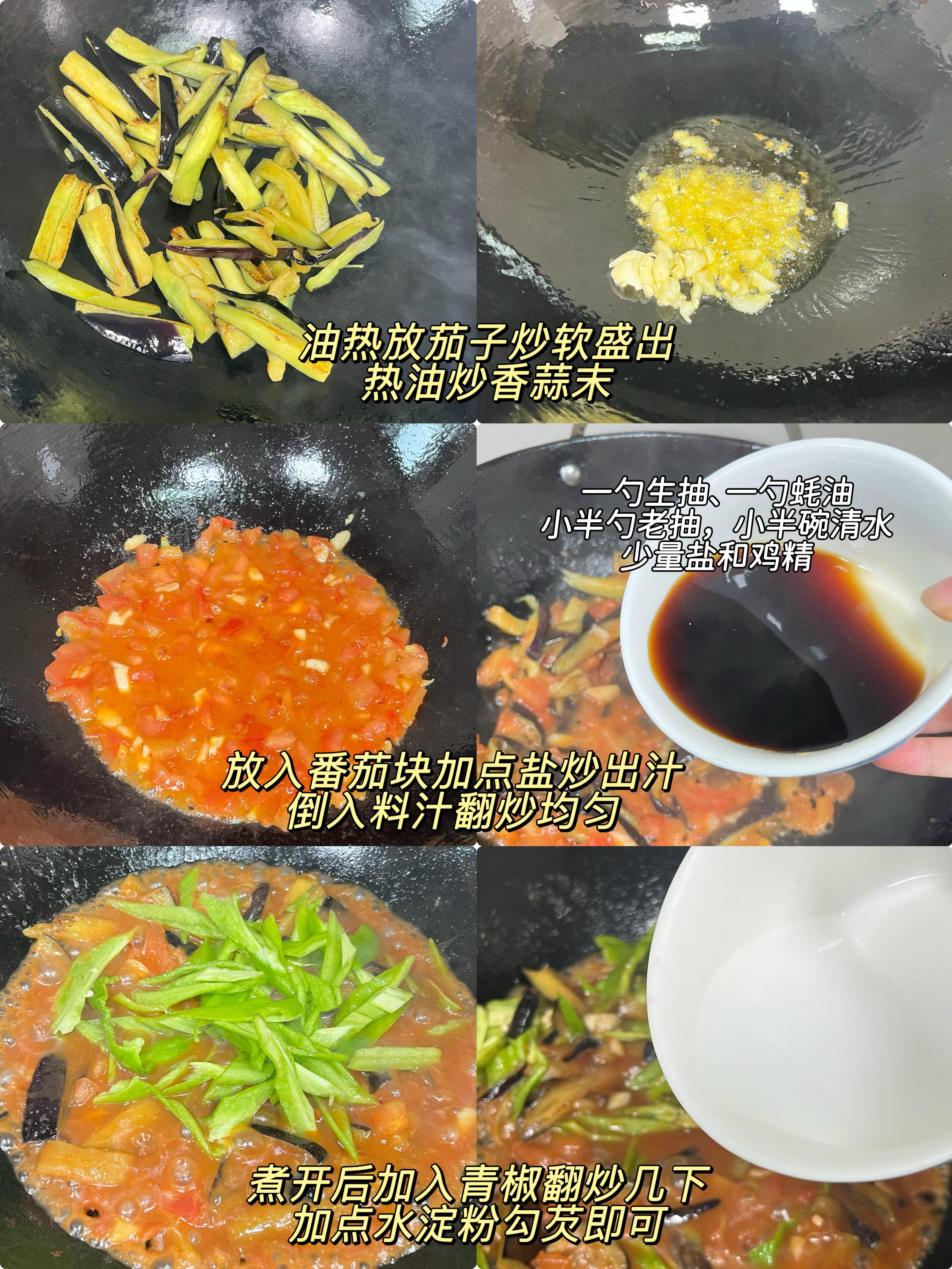 1⃣️ 锅中倒油,油热后放入茄子,翻炒至变软熟透,盛出备用;锅中留底油,放入蒜末炒出香味,再加入西红柿块,加少许盐,翻炒至西红柿出汁变软。