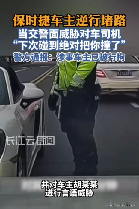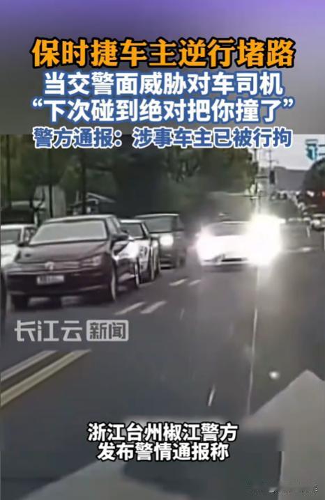 浙江台州,一39岁男子开保时捷跑车逆行,还用远光灯晃人。对向车道司机没有忍让,直接把车怼到保时捷车跟前,坚决不退让。当交警赶到时,男子还在和司机硬刚,交警足足劝说了2分多钟,男子才不情愿的倒车先行离开。结果在男子离开前,他还当着交警的面对司机进行警告,声称下次碰到司机,绝对要直接开车撞。司机忍无可忍报了警,这下男子惨了。