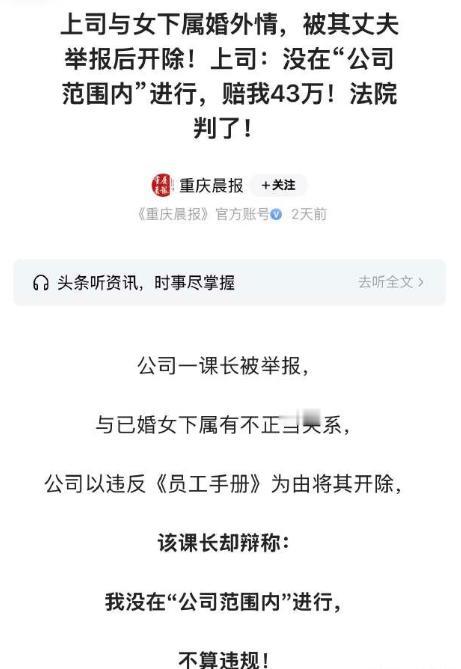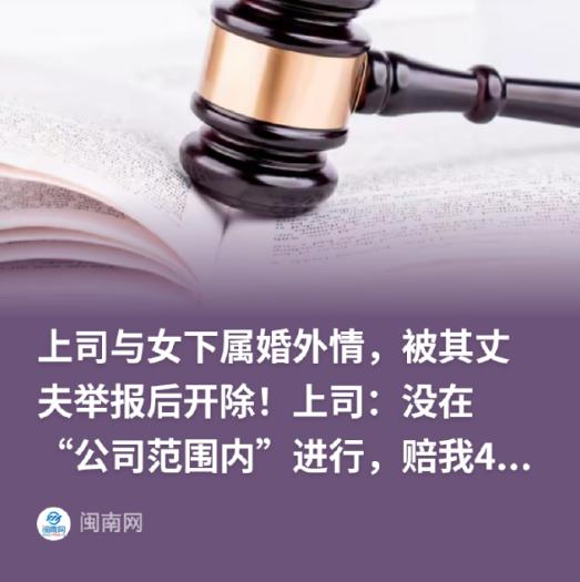 浙江宁波,一个男上司,贪恋已婚女下属的美貌,俩人竟然暗地里开展婚外情,这个领导月薪2.2万,好好的工作不做,非要开发人家的老婆,经常跟人家相约了去开房。这下人家的丈夫忍无可忍直接公开举报,男上司立刻就被公司给开除了。男子不服,要求公司赔偿自己43万元,他说“我搞婚外的恋情又没在公司范围内”。那就看看相关部门是怎么判定的。