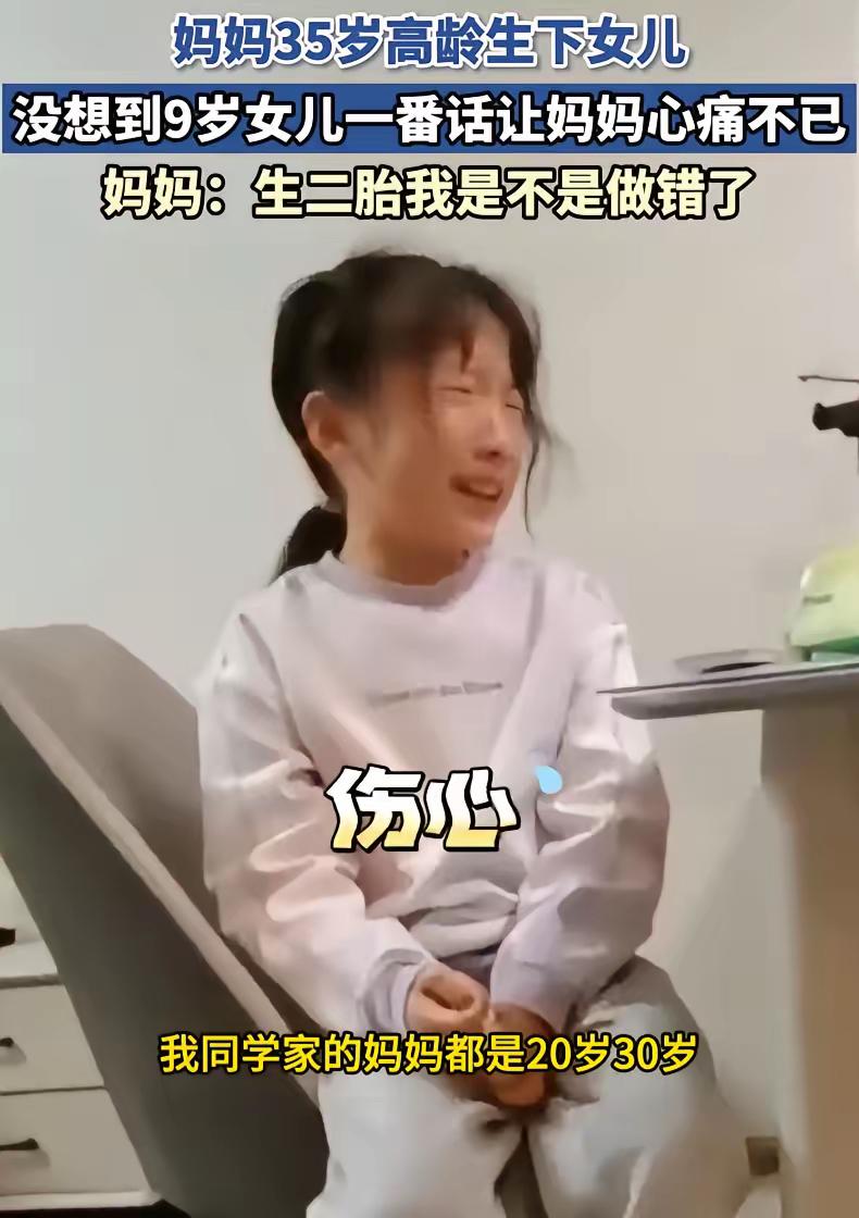 女子35岁时生了个二胎姑娘,可令她没想到的是,孩子今年9岁了,却在家里哭诉嫌她老,女子也没想到,女儿竟然心里有这么多的想法,当场怀疑人生:生二胎我是不是做错了?