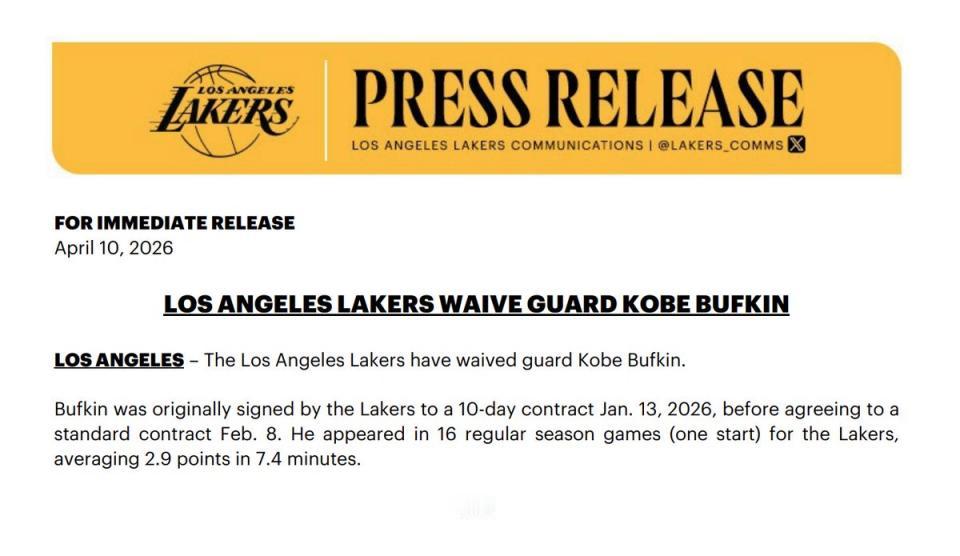 湖人官方今日宣布裁掉后卫科比-巴夫金。这笔操作将为湖人15人正式大名单腾出一个名额,球队预计在本周末评估填补该名额的人选。北京时间下周一是重新签下第15名球员的截止日——签约必须在湖人常规赛收官战前完成。