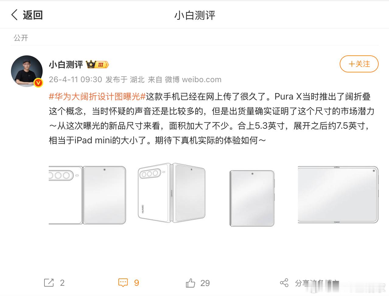 曝华为全新大阔折陆续到店华为大阔折4月20日正式亮相直接把期待值拉满。到店盒子明显比其他的又大又阔,5.3英寸外屏+7.3英寸展开屏让它适配多种使用场景。喜欢大屏的朋友们不要错过华为还有更大的Pura