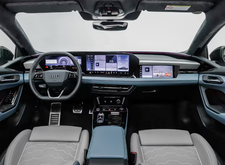 内饰方面,新车由11.9英寸奥迪虚拟座舱、14.5英寸MMI中控屏、10.9英寸副驾娱乐屏、AR-HUD抬头显示、电子外后视镜双屏组成六屏联动系统。其中副驾屏支持隐私模式,第二代增强现实抬头显示AR-HUD可显示速度、交通标识、导航等信息;第二代后视镜双屏采用高清显示屏,提升雨雾、低光环境下清晰度。中控屏内置Avatar情感化语音形象和智能语音助手,支持“可见即可说”,60秒内可连续识别10条指令。