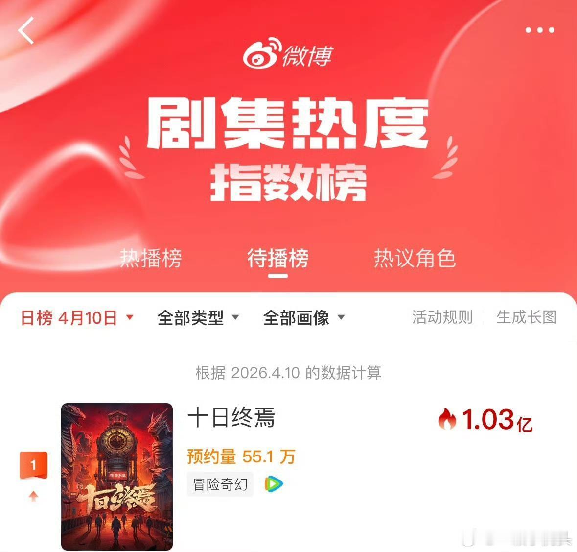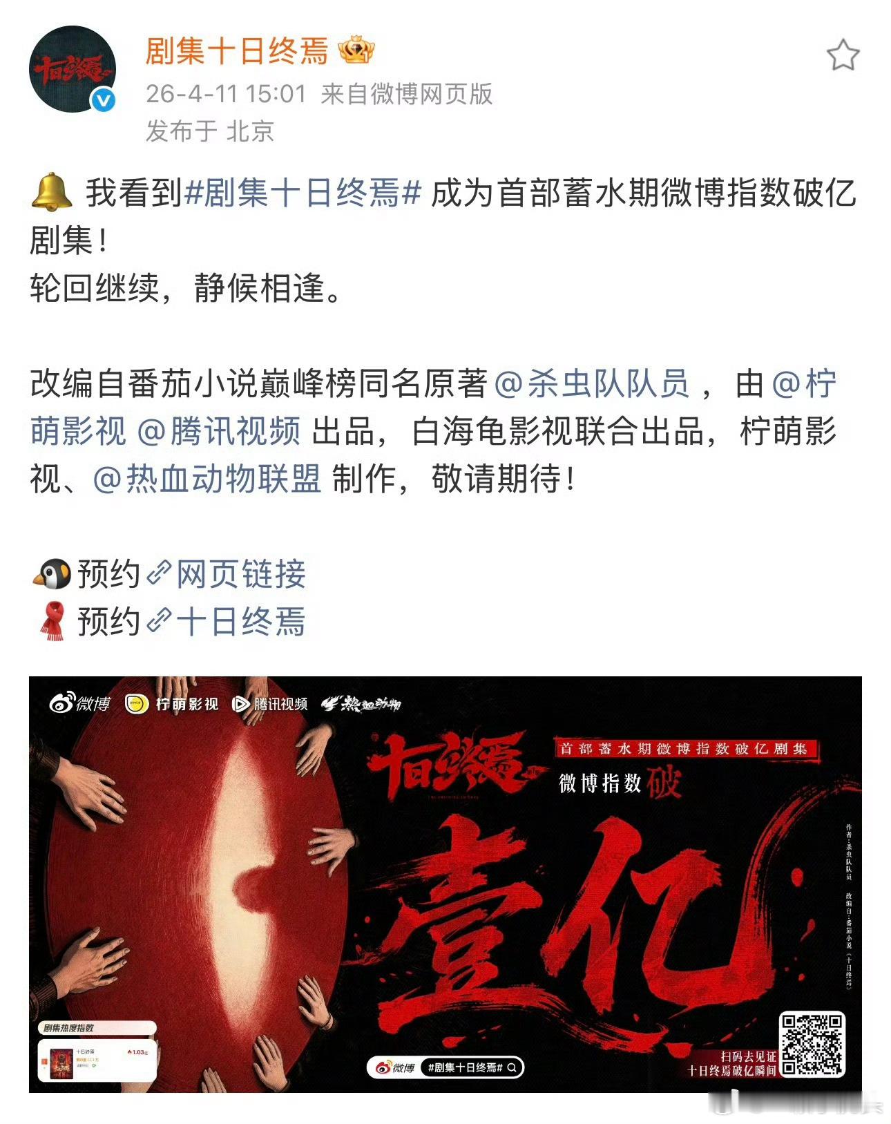 肖战十日终焉刚开机就破纪录啊,成为首部蓄水期微博指数破亿的剧集👏十日终焉微博指数破亿