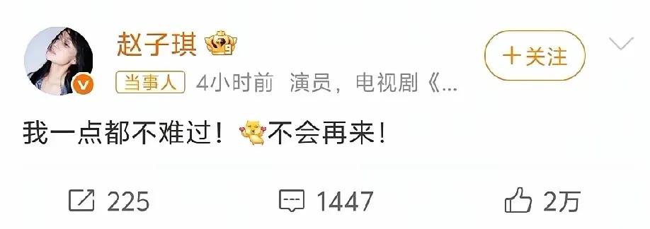之所以这样发,不是赵子琪输不起,而是她不能接受节目组的冷冰冰。不允许拿东西,直接被安排真人秀的离别状态,一个人回到宿舍。赵子琪表现的非常好,笑着离开,让大家不要难过。孙怡和张慧雯已经泣不成声,目送赵子琪径直走向了场外。没有回到姐姐休息的地方,直接是宿舍。