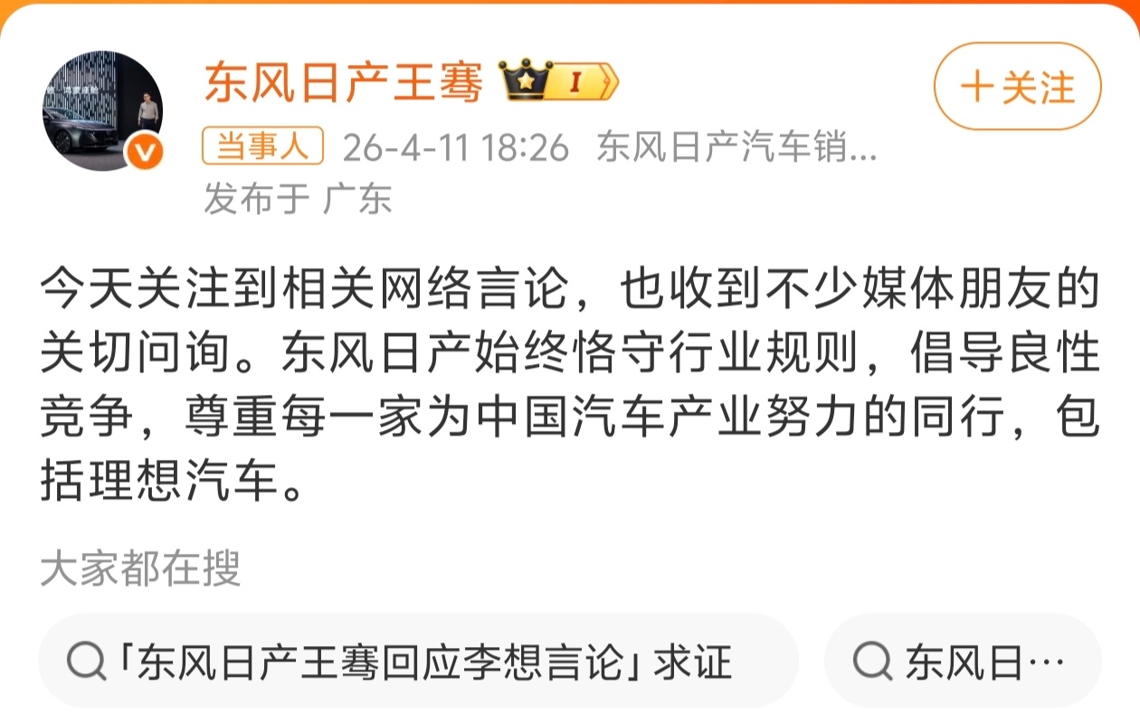 我们的车主粉丝、我们的科技汽车自媒体,也要积极呼吁各大车企要良性竞争。加油。东风日产高管回应李想喊话