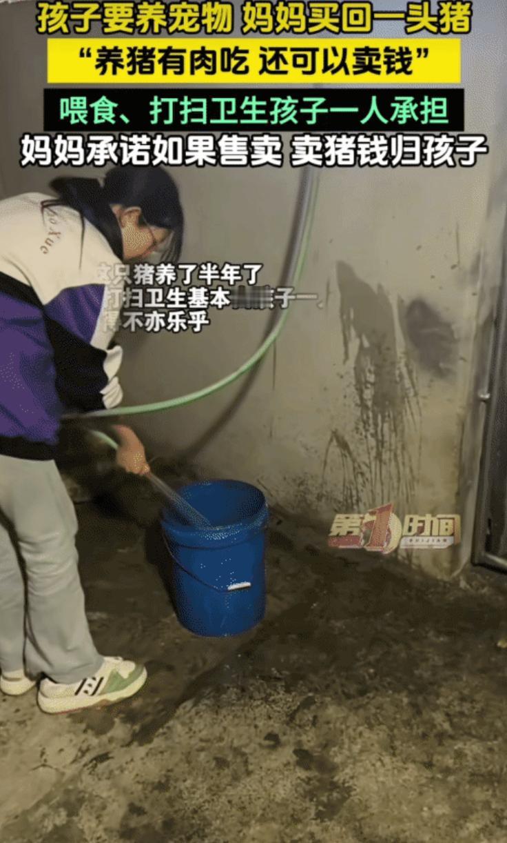 女孩上小学三年级,想要一只品种猫或小狗,妈妈没拒绝,也没答应,改成了一个“交易”。买回一头二十来斤的小猪崽,约法三章,养大了可以卖,卖多少钱都归她,但喂养打扫全由她自己来。