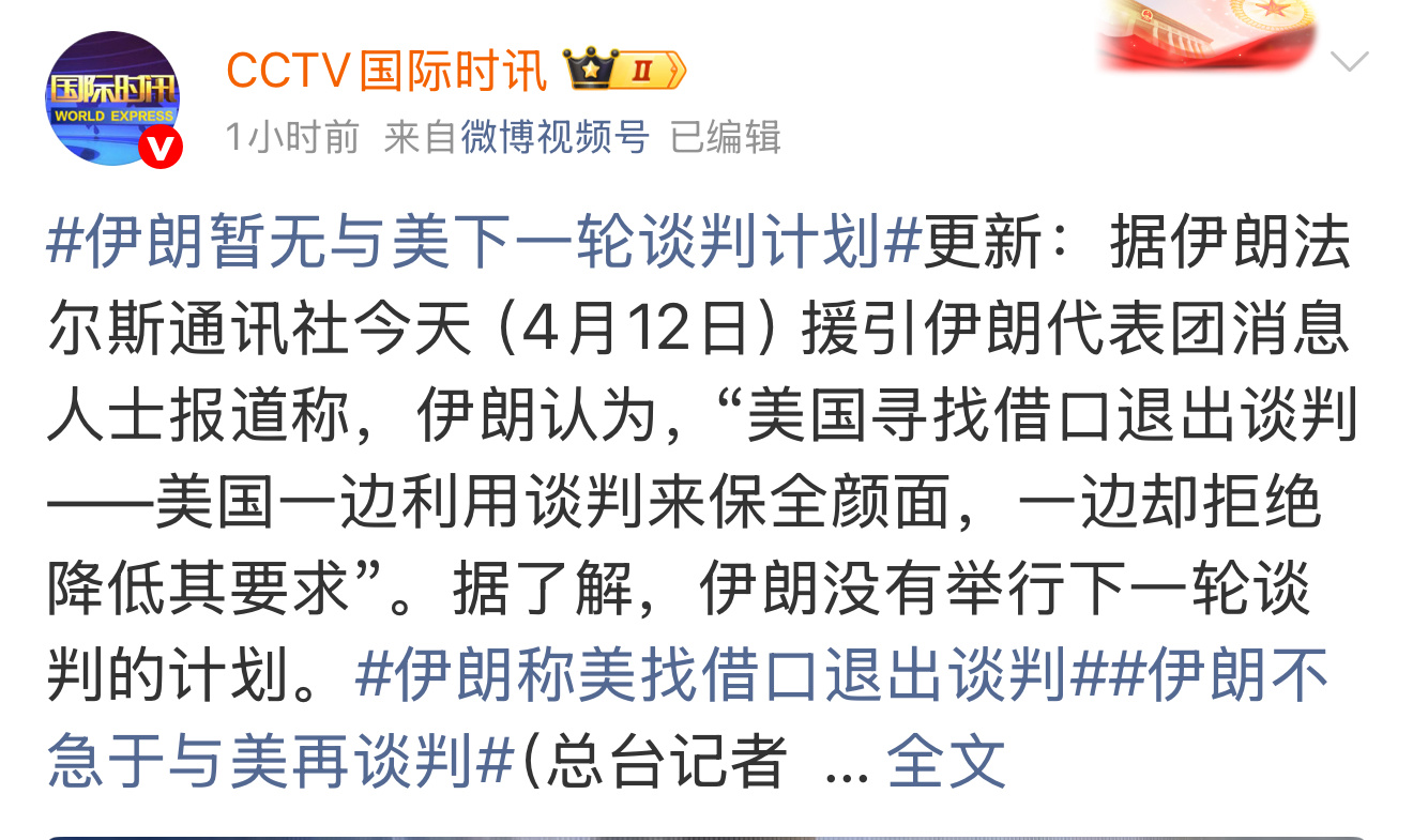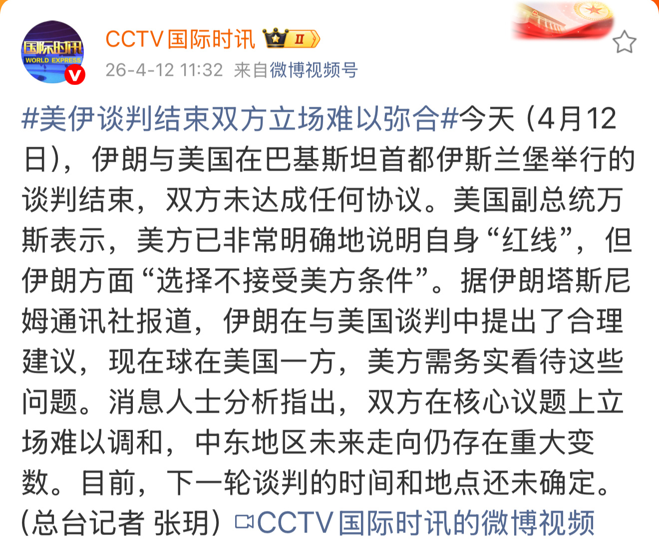 美向伊朗提出最终方案 美国和伊朗在巴基斯坦伊斯兰堡谈判。整场谈了大概21个小时。最终没达成任何协议。美方称已拿出最终方案,是伊朗不接受。伊朗称美方借谈判保颜面,不肯松要求。伊朗目前没有下一轮谈判的计划。