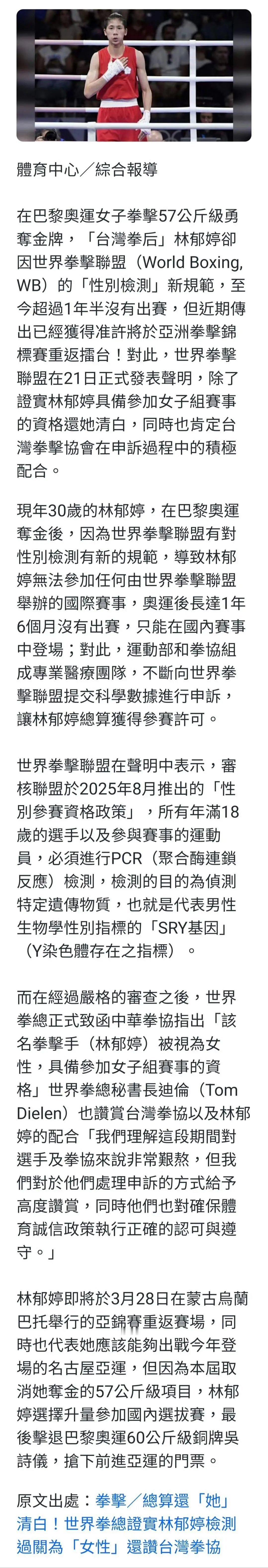 曾被jk罗琳质疑性别的拳击手林郁婷被证实自出生以来即为女性“female since birth”