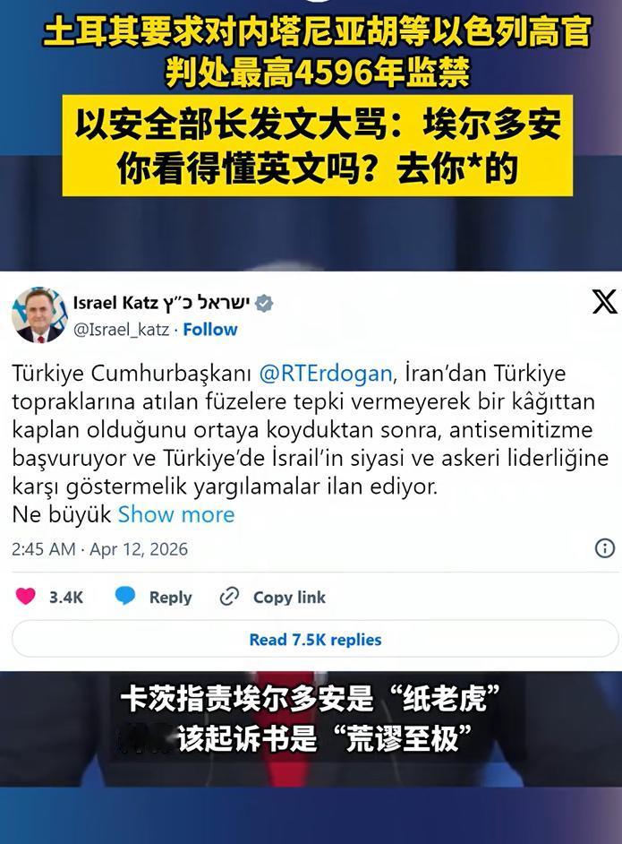 土耳其被说是“纸老虎”,这能忍吗? 如果这能忍,那以色列安全部长骂埃尔多安,直接用上F开头的单词了。 这应该忍不了了吧。 现在美以的颓势已经很明显了,土耳其敢不敢利用这个时机,直接下场呢? 你觉得埃尔多安会做出什么选择?