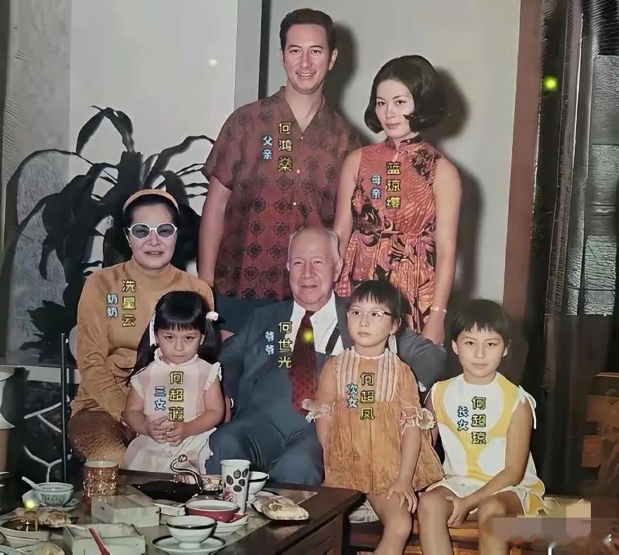 赌王和二太蓝琼缨一家早年全家福!那时候何猷龙还没出生,赌王还很年轻!何超琼出生的
