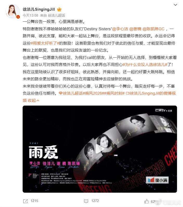徐洁儿回应自己没人选被低估的实力,终会在舞台绽放。徐洁儿《雨爱》舞台太圈粉,声线独特、表现力拉满,已经坐等二公舞台!