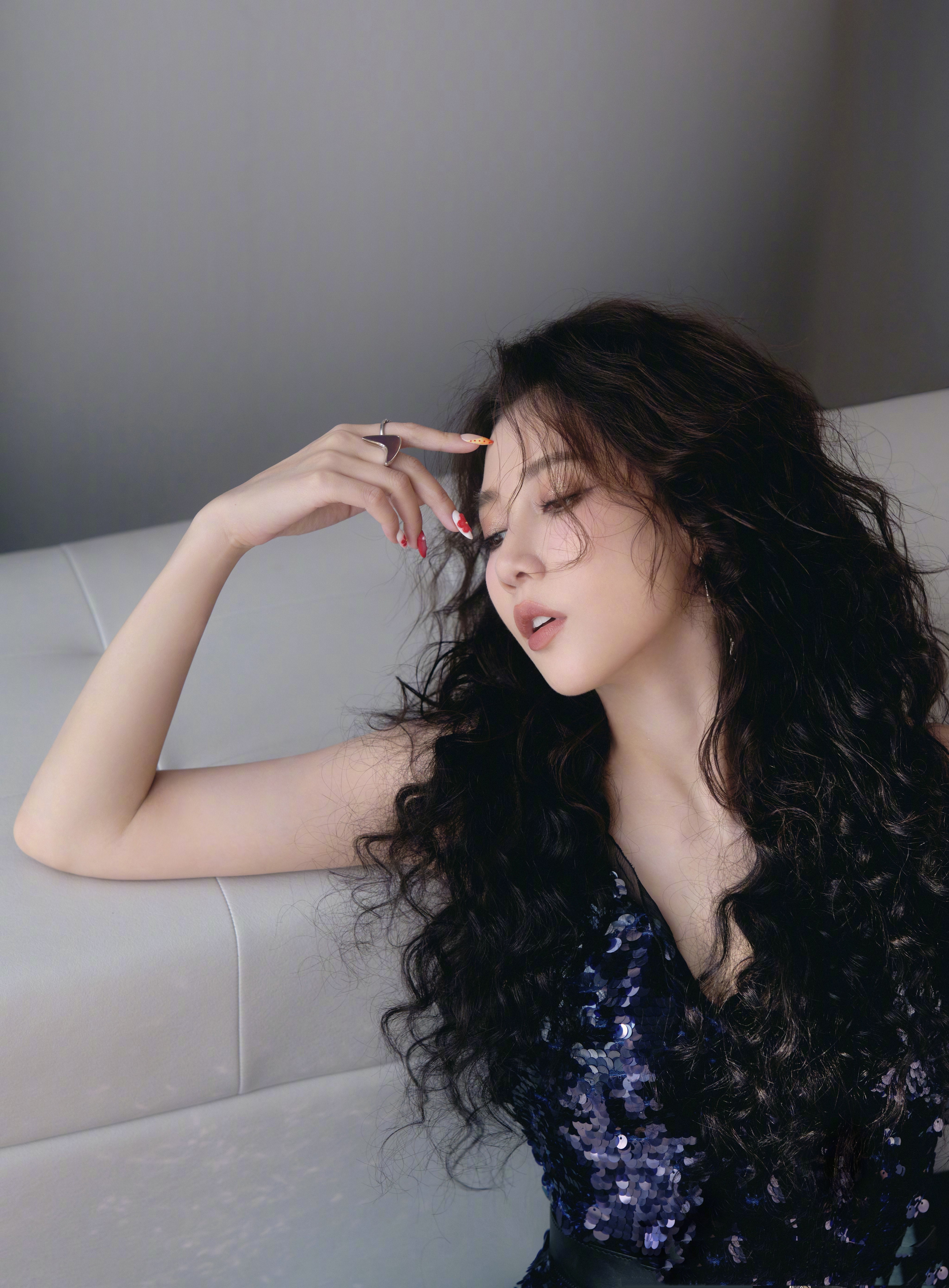 殷桃这状态,是多少女生的终极梦想?😻一袭酒红细闪吊带裙,波浪卷发+精致红