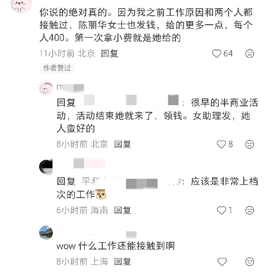 评论区有人回复,他太太陈丽华更大方,也是见人就给红包,一人400块。