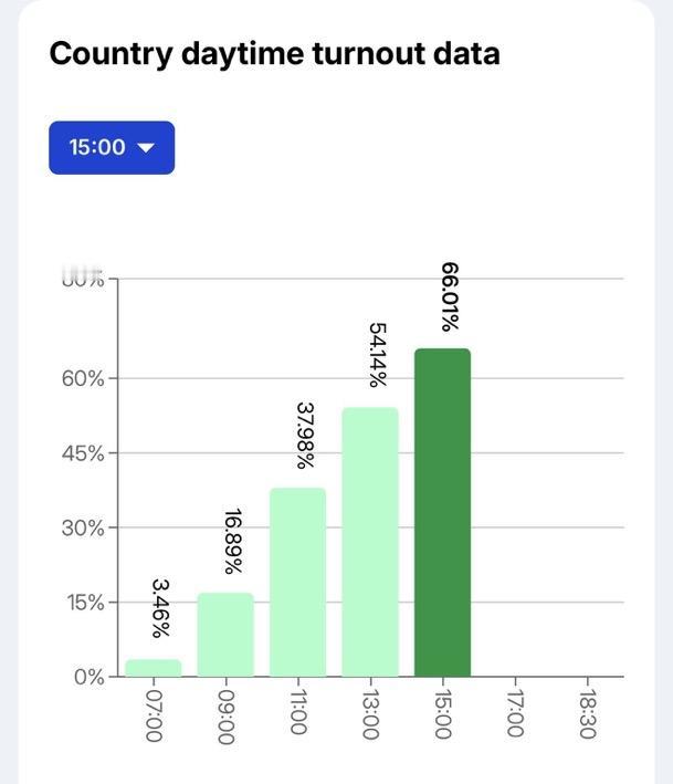 匈牙利选举投票率在下午3点已达66.01%(2022年:52.72%)。布达佩斯和其他倾向支持反对派的城市遥遥领先。