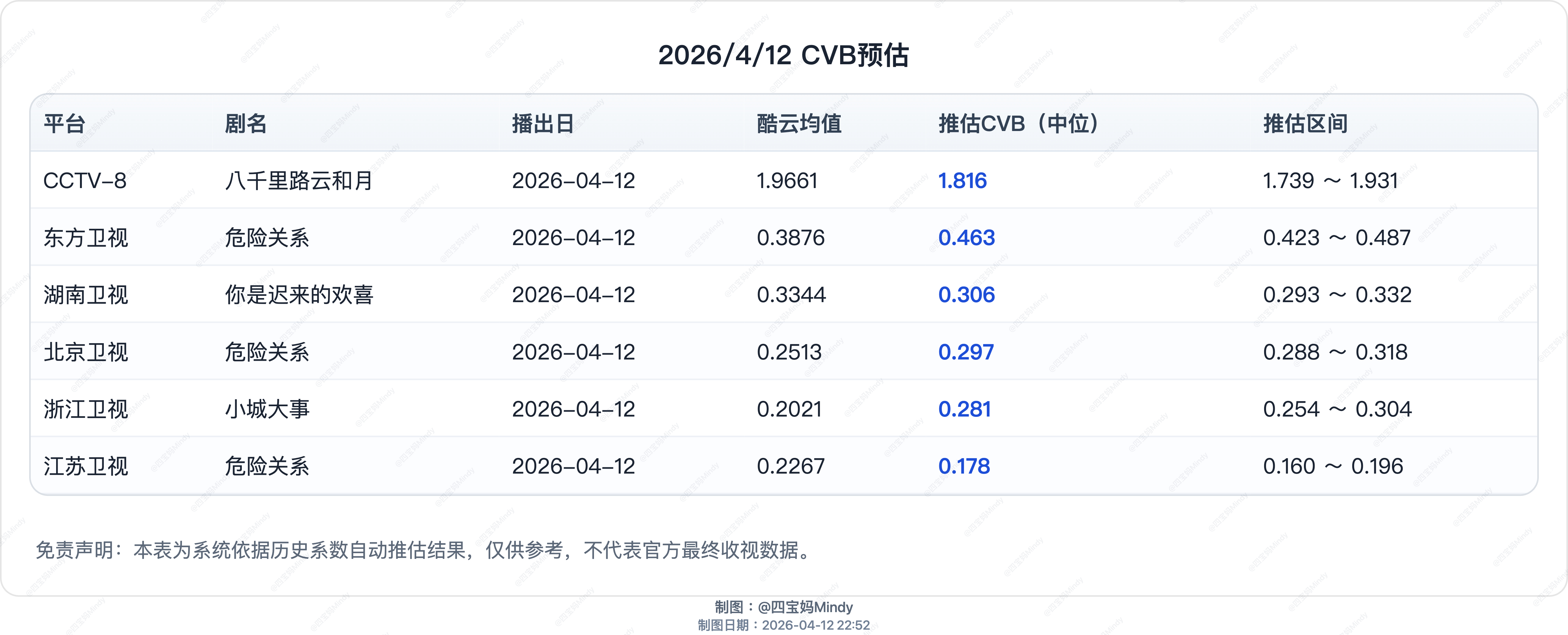 更新4.11cvb后,修正全剧预测值今天更新在播剧:八千里路云和月、危险关系、你是迟来的欢喜