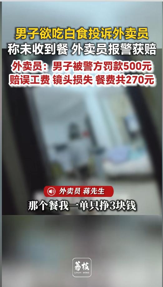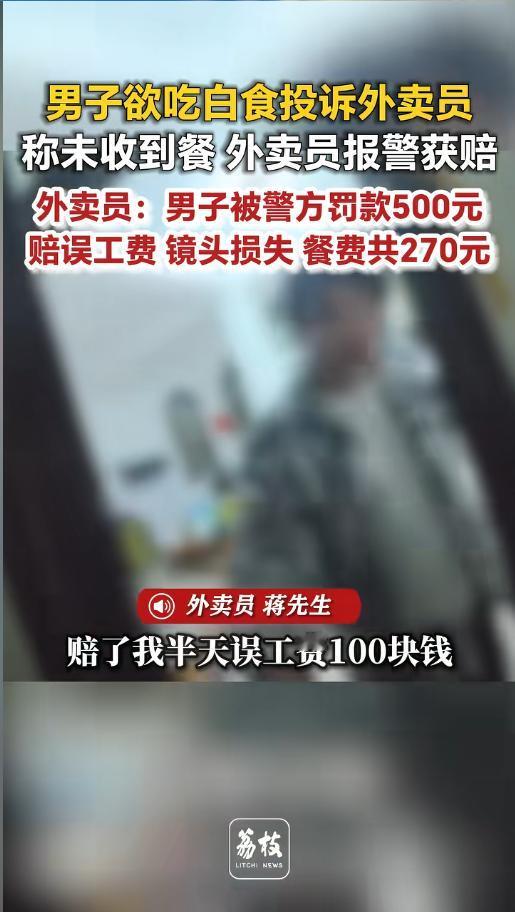 信息来源:《男子欲吃白食投诉外卖员 称未收到餐 外卖员报警获赔 外卖员:男子被警方罚款500元 赔误工费 镜头损失 餐费共270元》荔枝新闻