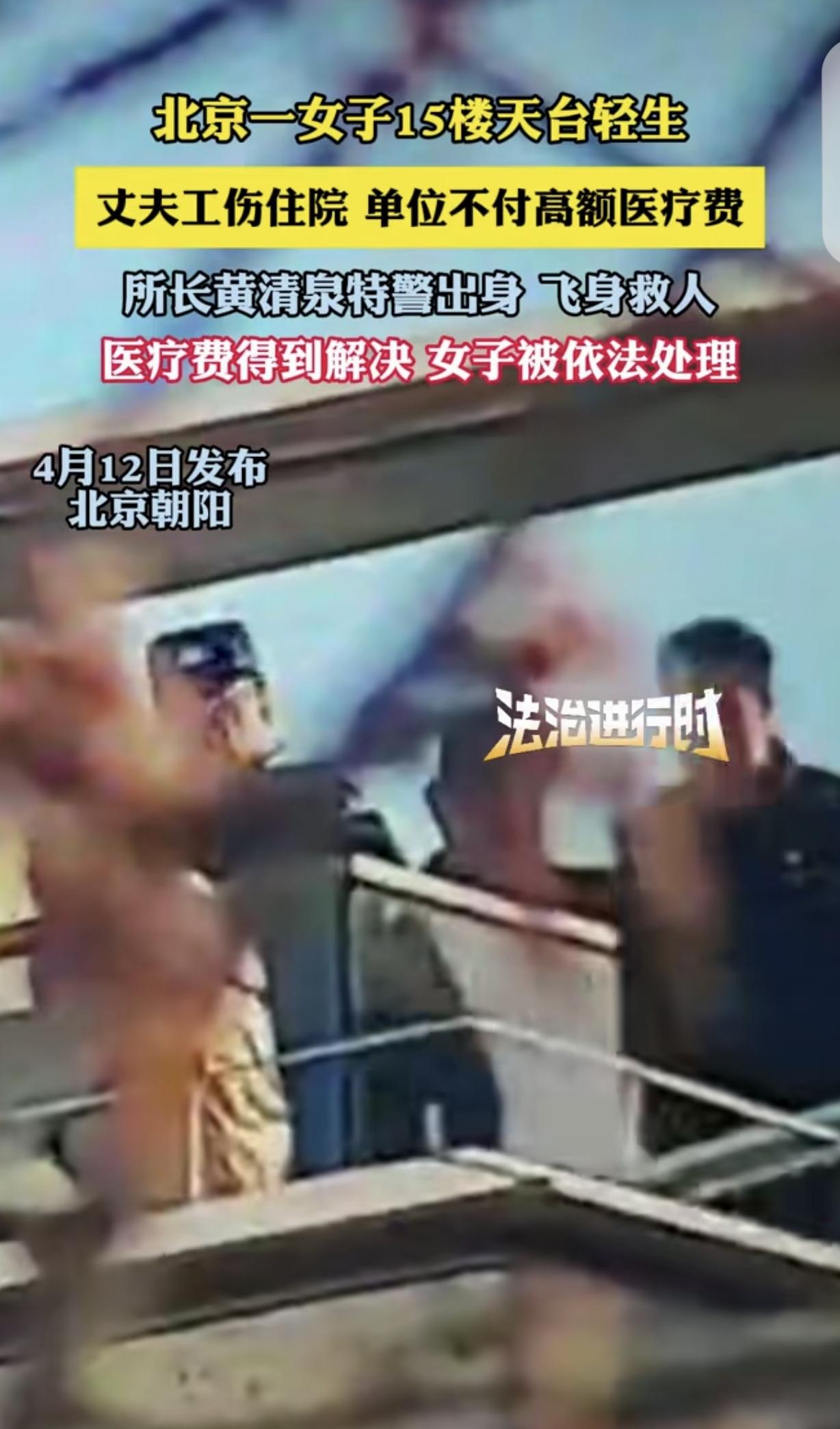 “没有比人再坏的了!”北京朝阳,一女子丈夫工伤住院,单位竟不付高额医药费,把女子逼的走投无路,她不想活了,也活不起了,一怒之下跑到15楼天台,坐在护栏外,不足30厘米宽的檐上,双腿悬空,哭着喊着要跳楼轻生,这事闹大了,女子被救下后,丈夫的医药费得到解决,她却被依法处理了。网友:娶了个好女人,为老公敢拼命!