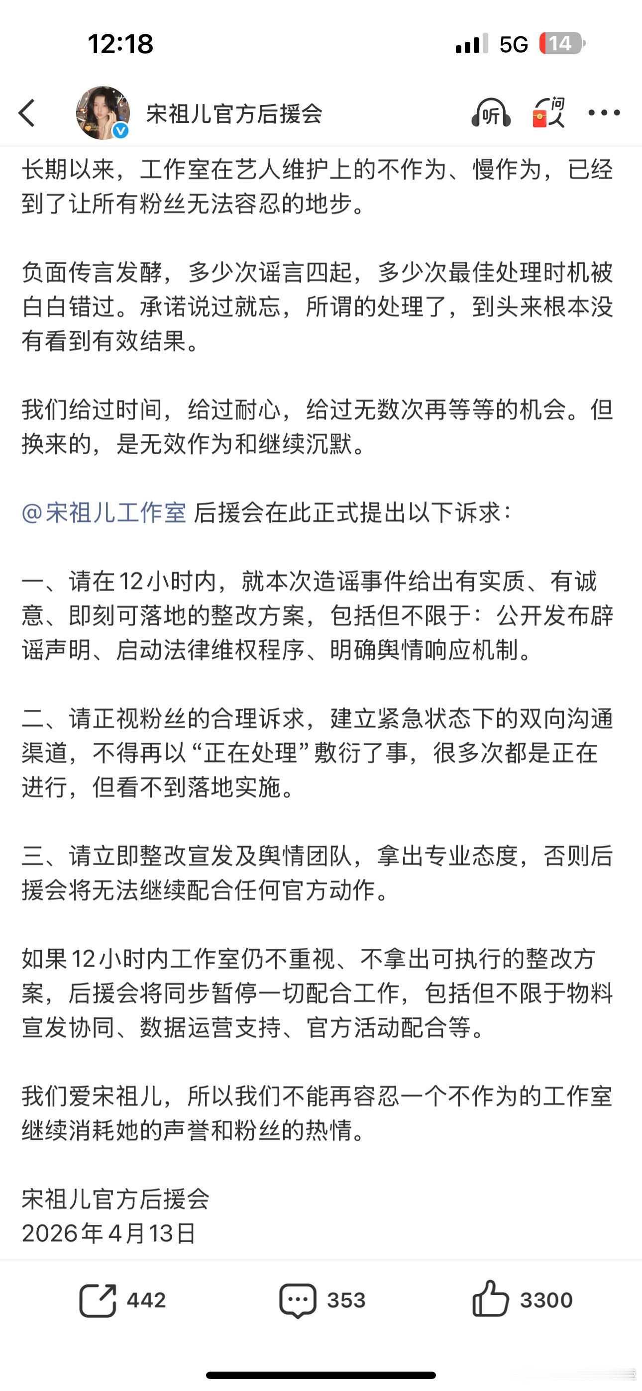 宋祖儿粉丝发文维权 宋祖儿粉丝开始维权了,她工作室从任何方面说确实不作为,支持维权