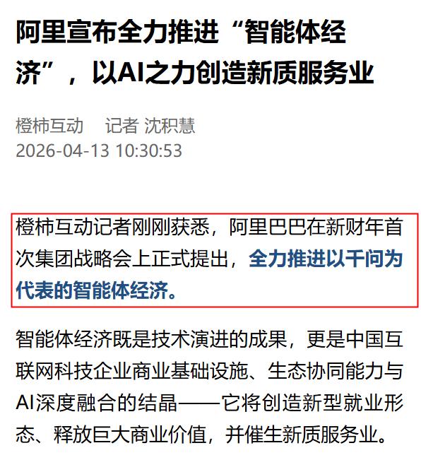 新闻媒体报道称,阿里巴巴在新财年首次集团战略会上,正式提出,全力推进以千问为代表的智能体经济。