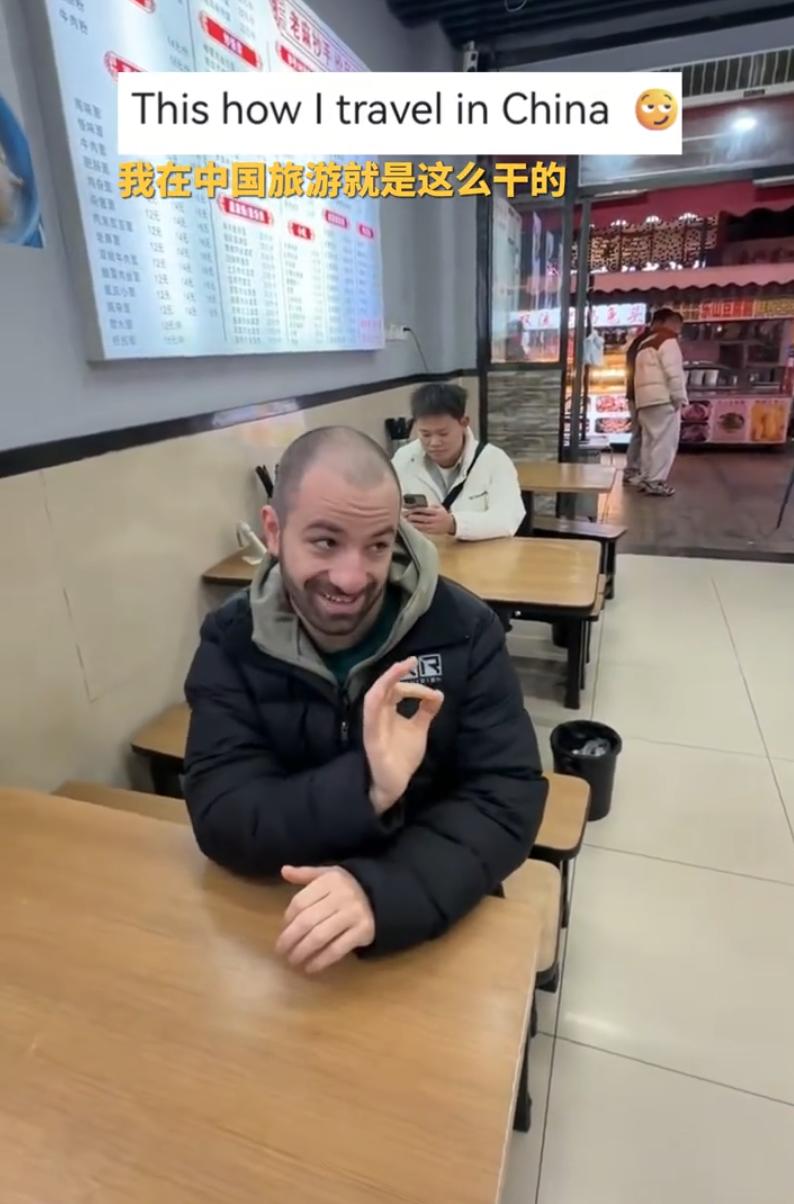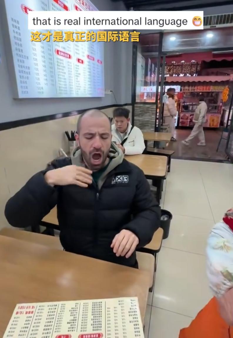 视频中,老外先抬手,稳稳指向墙上贴着的担担面菜单,再点点自己胸口,又指了指对面同伴,接着伸出两根手指——两碗。老板心领神会,点点头,两个意思,明白