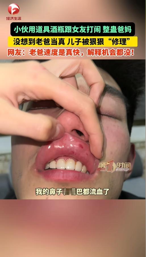 据媒体报道,小伙儿事先买了个酒瓶道具,质地很软,打到身上也不疼,想要整蛊一次爸妈。他也提前跟女朋友商量了,两个人一起在爸妈面前演一场戏。