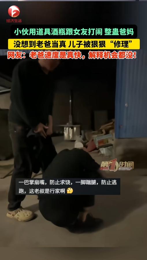 “自作自受!”近日,河南新乡,一小伙跟女朋友商量好,用道具酒瓶打闹,整蛊爸妈。可没想到,小伙一酒瓶下去,老爸当了真,冲上来照着嘴就是一巴掌。女朋友还没反应过来呢,转眼又是一脚踹倒在地!网友:还演不演了!