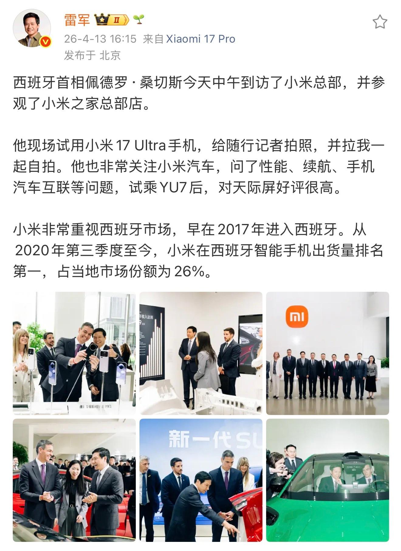 西班牙首相佩德罗·桑切斯今天中午到访了小米总部,并参观了小米之家总部店。他现场试用了小米17 Ultra手机,给随行记者拍照,并拉上雷总一起自拍;也非常关注小米汽车,问了性能、续航、手机汽车互联等问题,试乘YU7后,对天际屏好评很高。