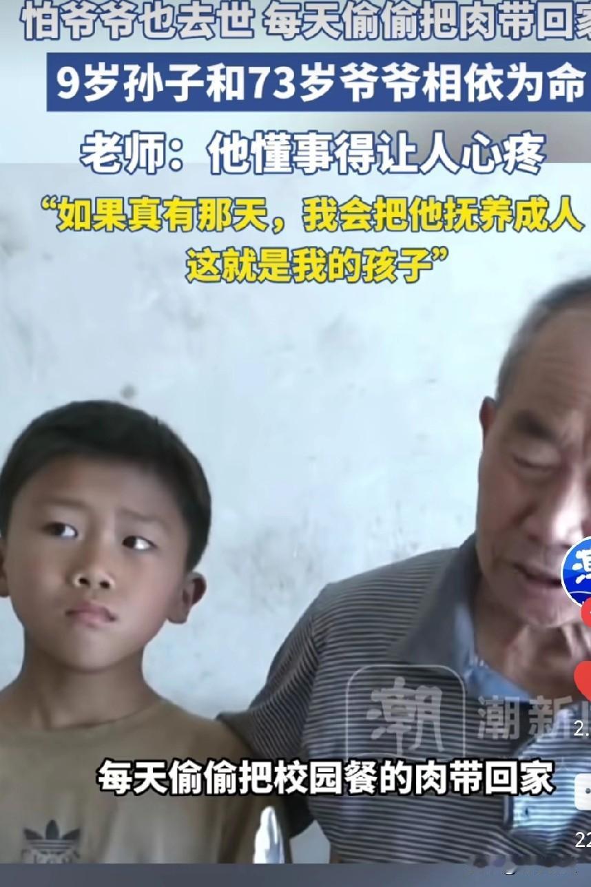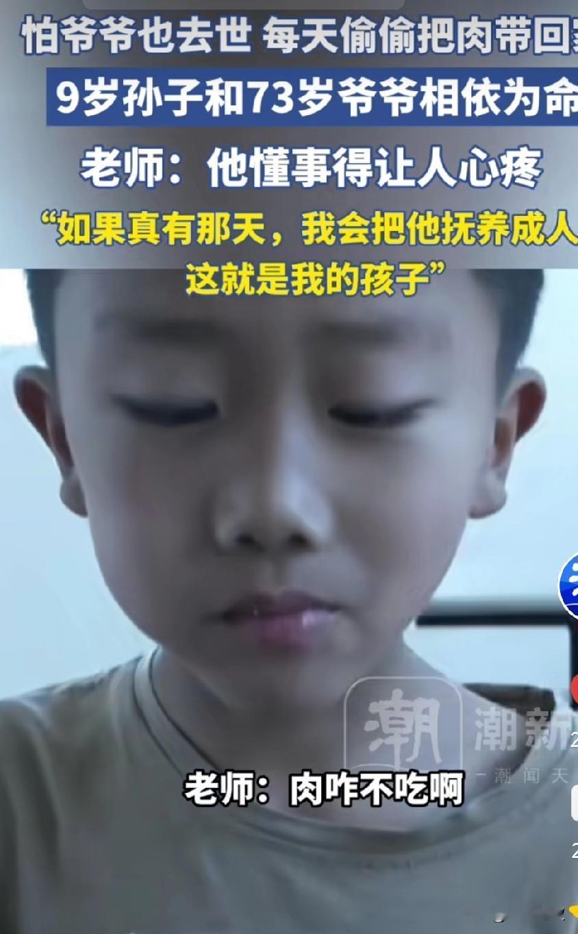 看到一个泪目的新闻,河南周口一个九岁的孩子,每次总是偷偷把学校午餐的肉带回家给爷爷吃,老师偶然得知,到他家里了解情况才知道,孩子的爸爸因病去世,母亲改嫁,接着奶奶又去世了。孩子怕爷爷吃不上肉没有营养,也离自己而去,自己在这个世界上就没有亲人了。