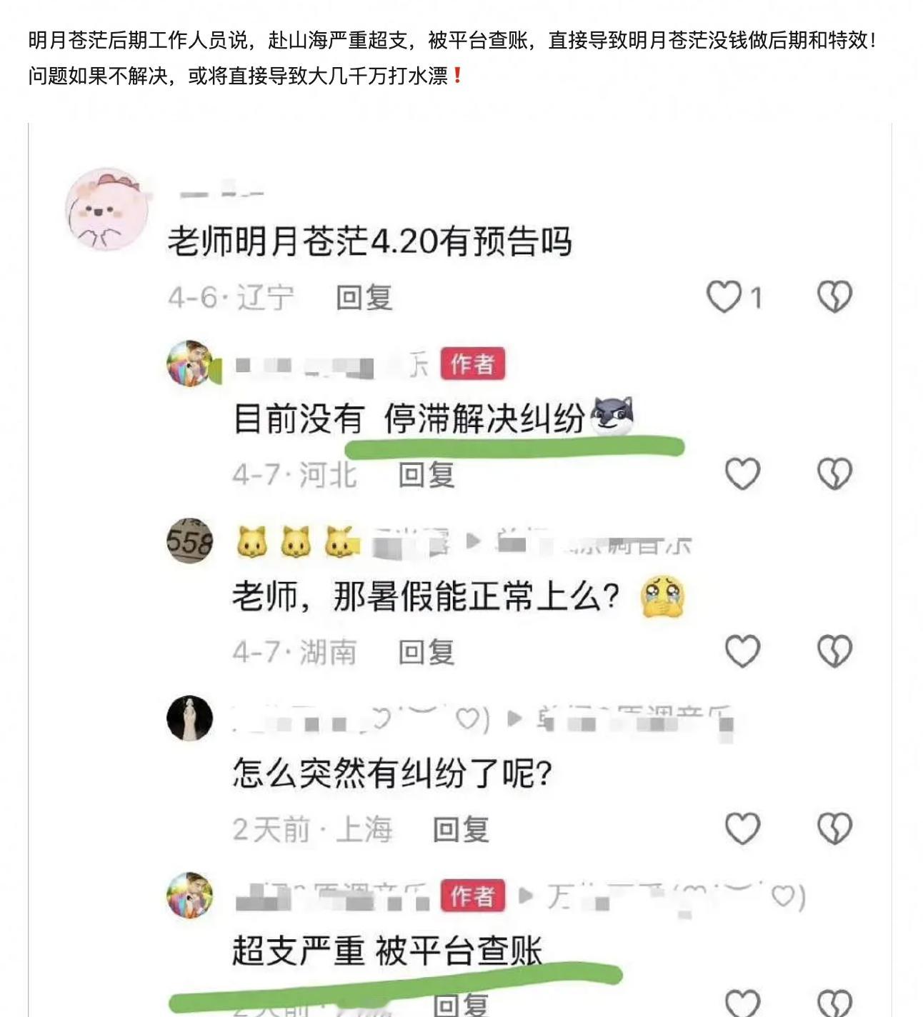 明月苍茫后期工作人员曝《明月苍茫》停滞了,要解决纠纷,还有后期和特效都没做完,超支严重,还牵扯到另一部剧《赴山海》。