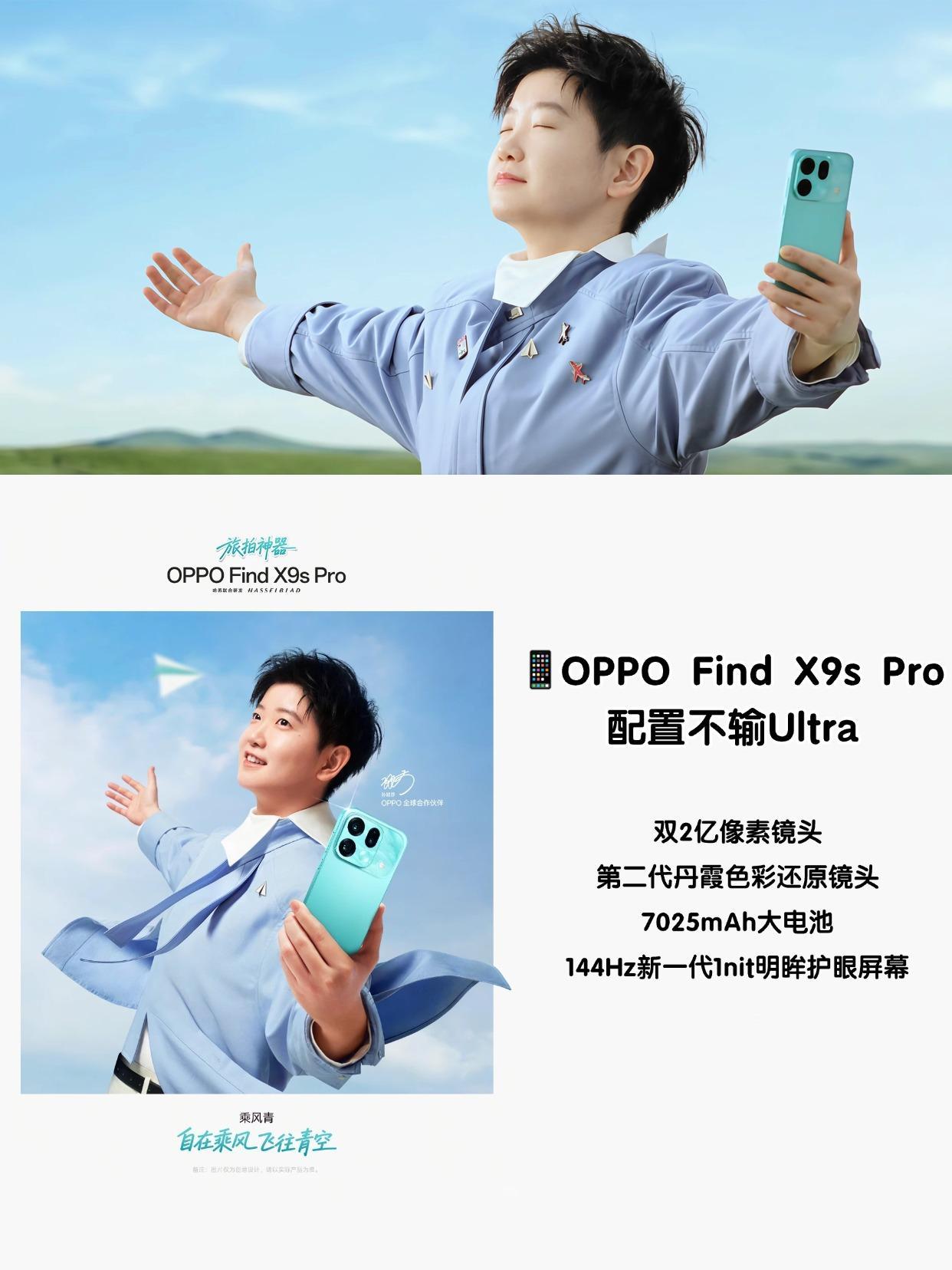 Find X9s Pro这手机颜值高,乘风青的命名非常契合莎莎,做一阵风,自由自在,而且配置相比之前的Find X9 Pro提升很大,用上了双2亿像素和第二代丹霞色彩还原镜头,拍照画质更强、色彩还原更准确,加上全新大师模式胶片滤镜,出门拍照都不用带相机了,其他还有7025mAh大电池、超声波指纹、 满级防水等等,这配置确实不输一些Ultra啊!