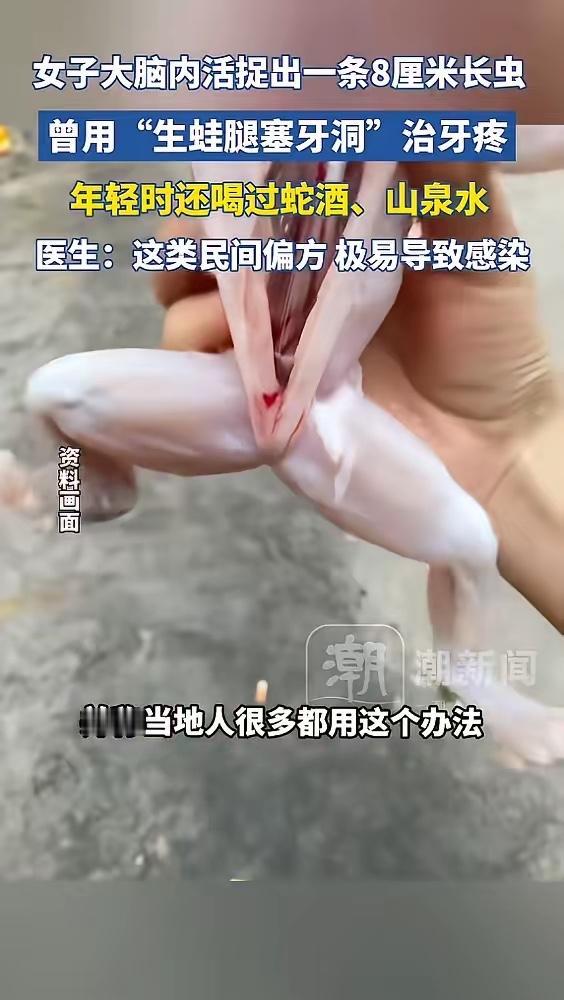 “太吓人了!”广东梅州,一女子因为牙痛,竟用生的青蛙腿塞牙洞,“钓牙虫”来缓解症状,并且还喝过蛇酒、山泉水等,结果突发抽搐、口吐白沫,被送到医院后,医生从她那脑内取出活捉出一条8厘米的裂头蚴!网友:这偏方太膈应人了!