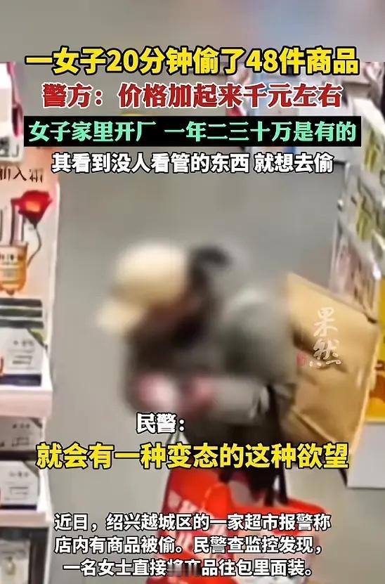 “万万没想到!”近日,浙江绍兴,一女子逛超市时,把自己遮的严严实实,趁周围没人,就把喜欢的商品藏到自己包里面,短短20分钟内,就盗了48件商品,没想到的是,女子年薪几十万,偷东西纯属“过瘾”!网友:理解不了!