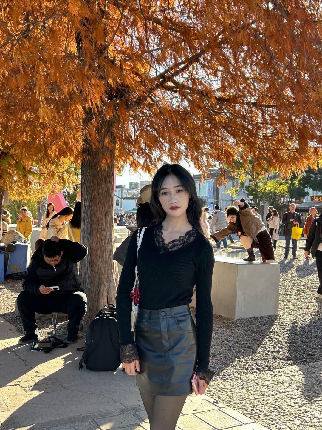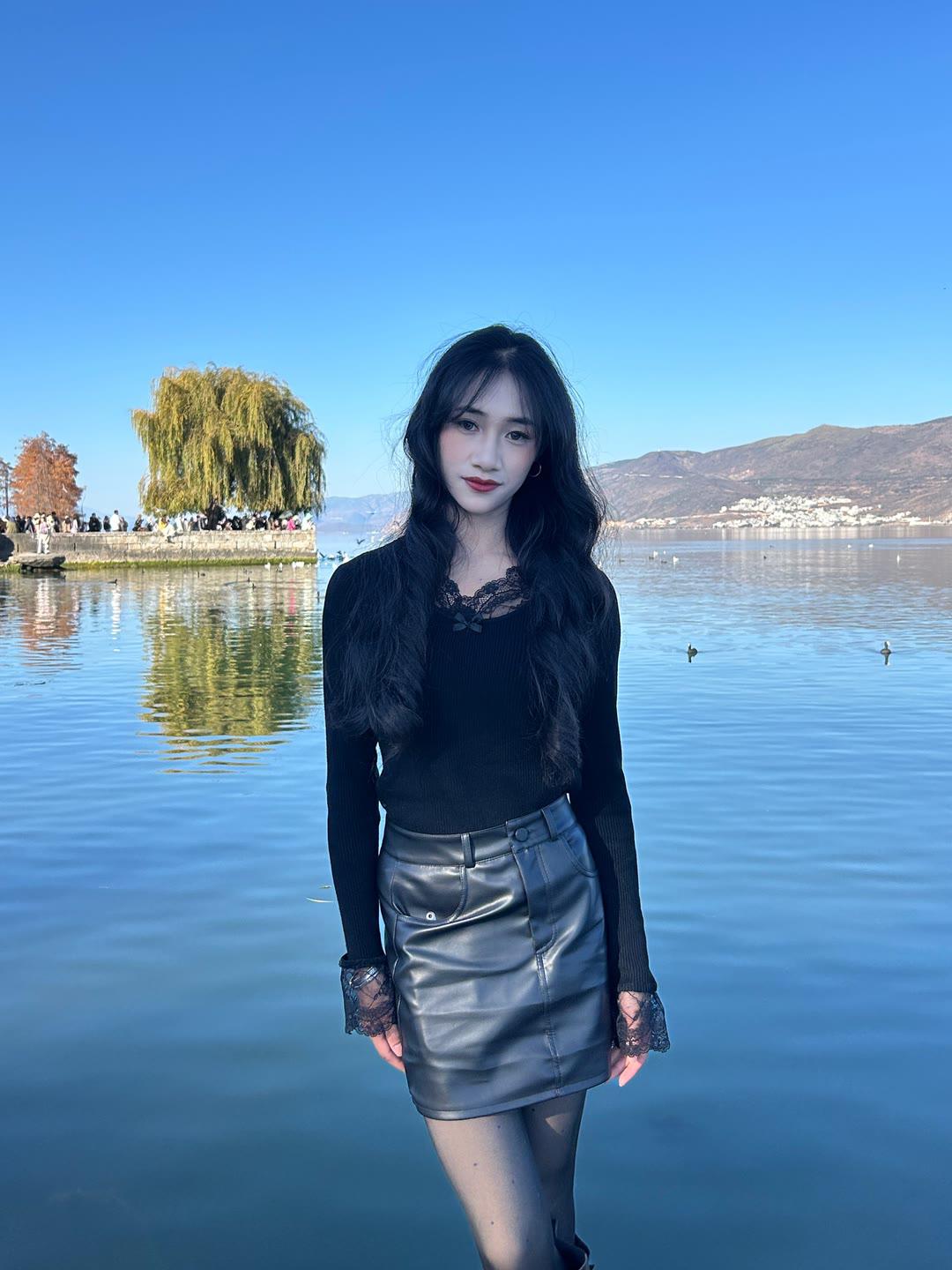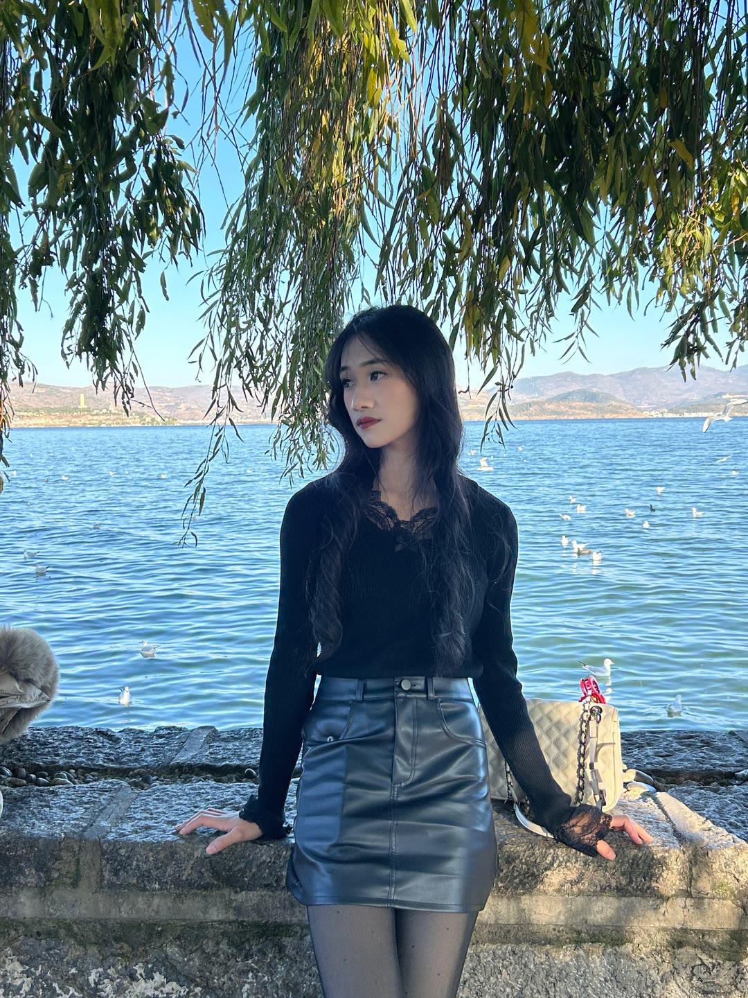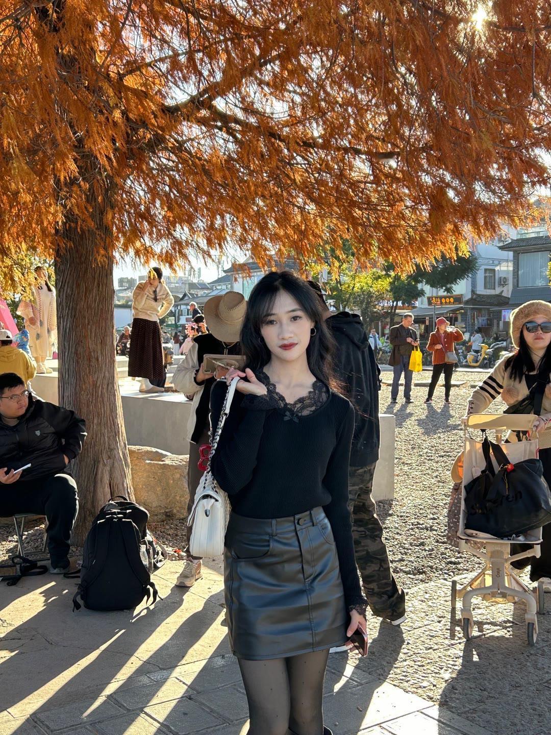 黑色针织上衣配搭粉色开叉裙,优雅又时髦,美呆了!