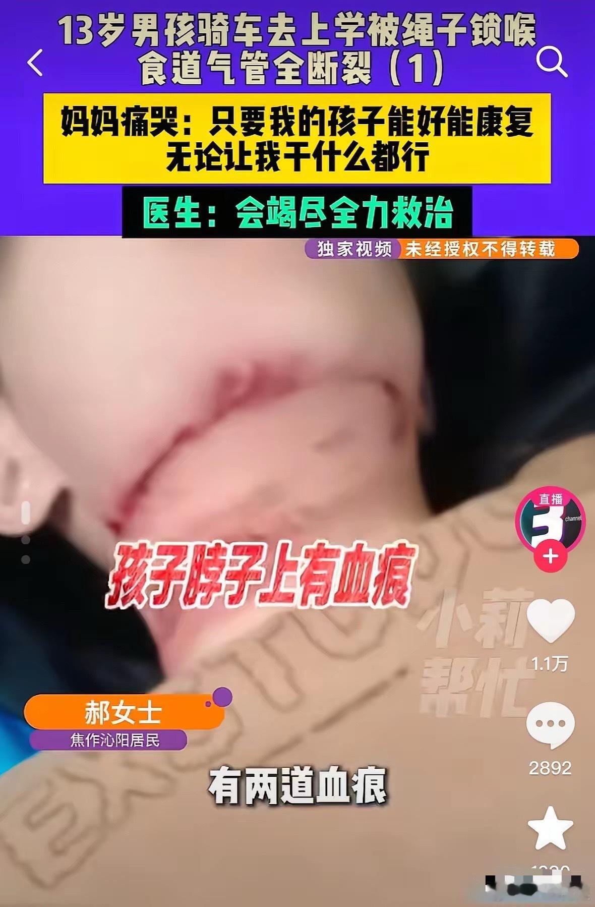 泪目!河南13岁被绳子润喉割断气管的男孩当天是去上补习班的,他的成绩非常好,在全校稳居前三!然而,因为邻居私拉的一根绳子,他现在都还躺在icu里抢救!这个男孩是河南焦作人,出生于2013年。一个好好的孩子,为什么会被绳子锁喉呢?一切都要从4月4日那天说起!当天正值清明假期,又逢周六,本是不用上学的。但男孩为了让自己的学业更近一步,还是骑着自行车出门学习了。不料,还没来得及出走村子,悲剧就发生了。一个老人为了方便自己打玉米,私自在村道上横向拉了一条绳子。其一头绑在树上,另一头则拴在电线杆上。男孩骑车路过的时候,不幸被绳子绊倒,连人带车摔倒在地。好巧不巧,他的脖子恰好被绳子锁喉,当即食管、气管就断裂了。一瞬间,他就说不出话了,连口水都咽不下去,连求救都无法做到。最终,他就这样强忍着巨大的疼痛,自己托着脑袋走回家了。至今没有人能够切身体会那一段路该有多远,他该有多疼?见到爸爸妈妈的那一刻,他的小脸都变了颜色。等到被送到医院之时,医生们都忍不住泪目了。哽咽的告诉家长:你们要有心理准备,能不能救活还不知道!时隔多天,孩子虽已被送到大医院救治,但截止到现在,他仍在icu里。整个事件背后,更让人心疼的一点是:孩子的母亲患有白血病和乳腺癌,在双重疾病的压力下,他的家庭非常困难。如今,又突生变故,然而,私拉绳子的那个老人仅仅只赔偿了一万元就再也不肯露面了!多好的一个孩子啊!他深知只有自己好好的读书才能改变命运,所以,在别人都在休息的时候,他还想着学习。不料,却遭遇了一场飞来横祸!希望通过此事件,大家能够有所警示:不管什么原因,一定不要占用公共道路。绝不能因为自己的一己私利,给大家带来安全隐患!如果不是那个老人在村路上拉绳子,悲剧绝不会发生。在此,愿男孩早日康复,早日回家!