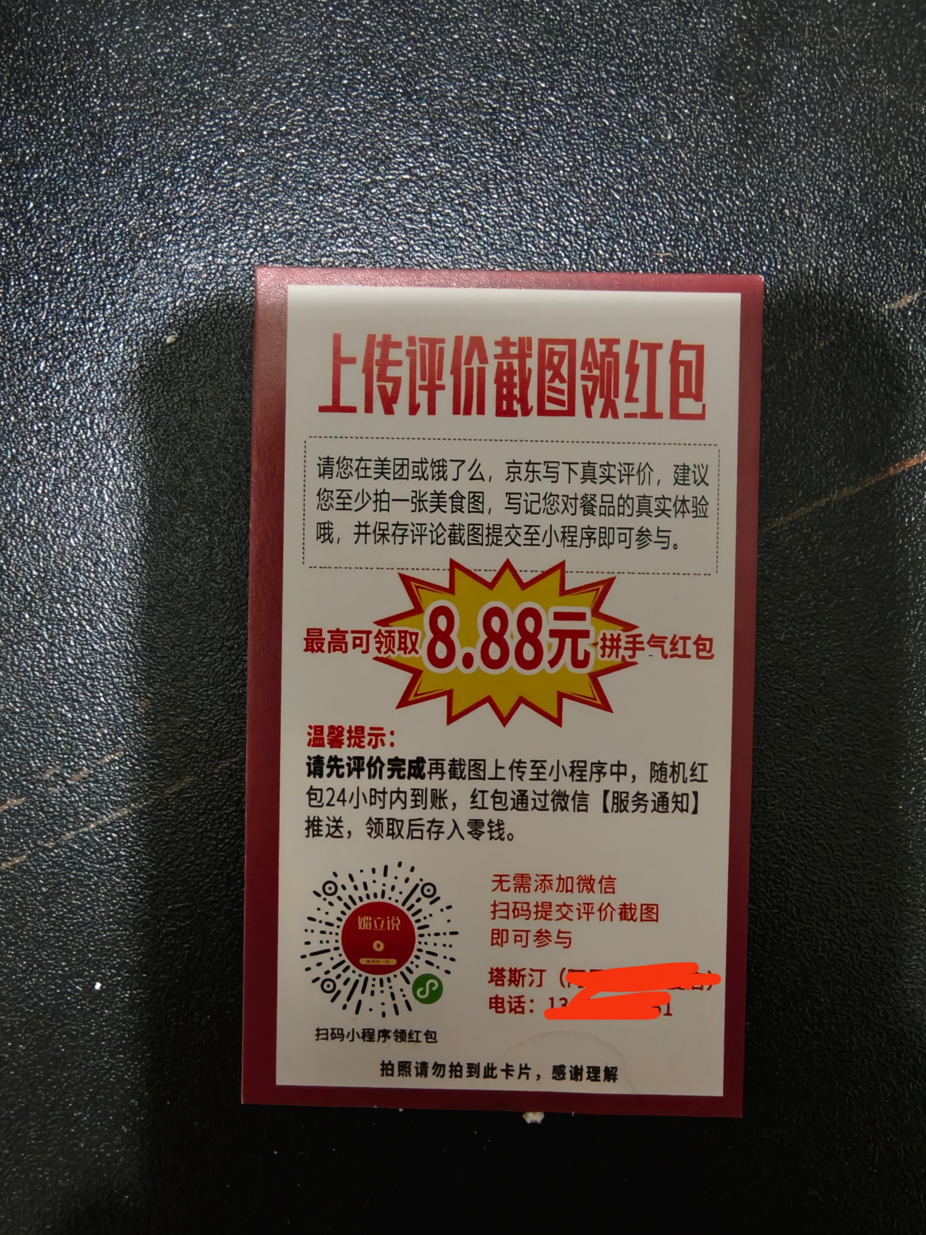 网上电商购物、点外卖是到这种上传好评,截图领红包的卡片,这种属于刷评论,属于干扰用户真实评价,平台应该予以管理。 没想到塔斯汀汉堡也干这种事!!!#塔斯汀# #塔斯汀中国汉堡#