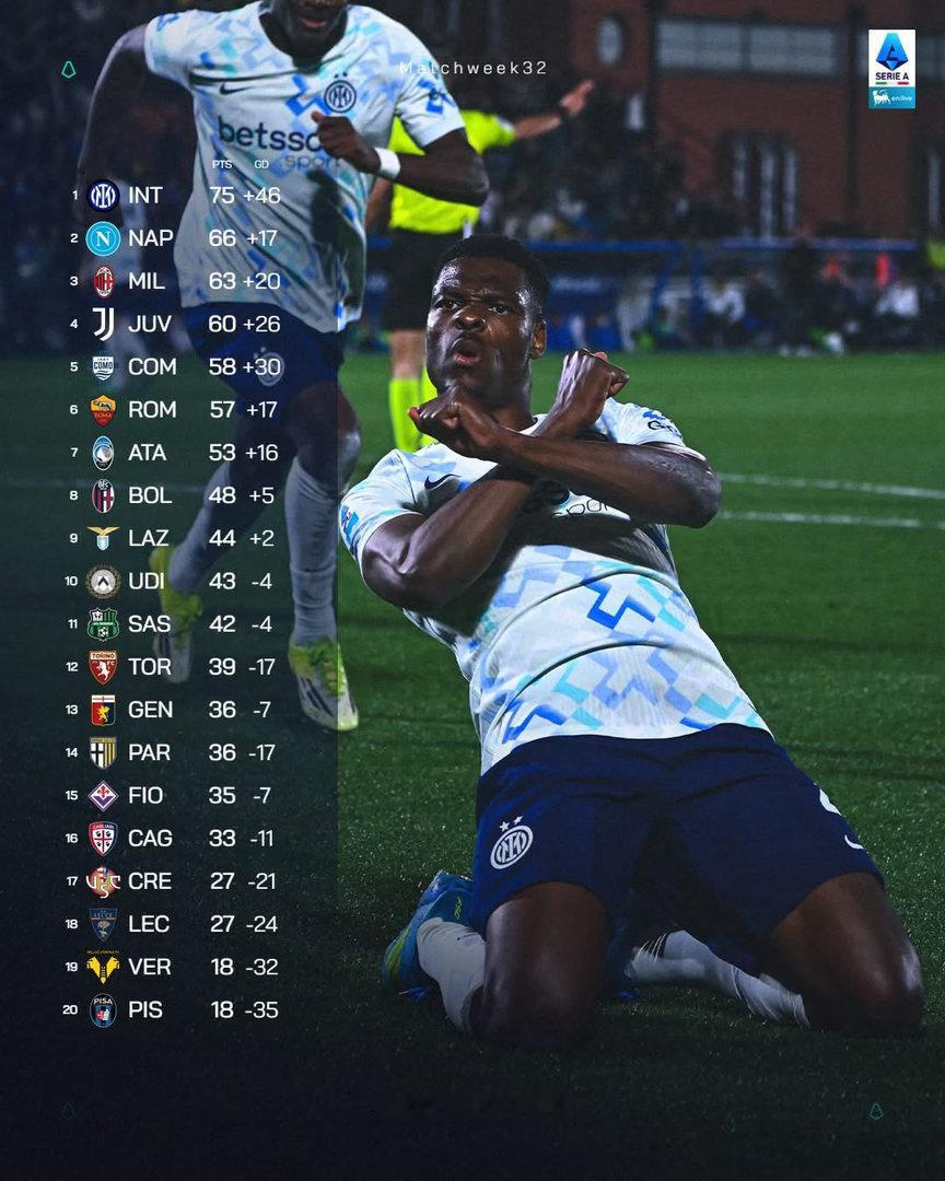 意甲第32週賽事賽果-羅馬3-0 比薩卡利亞里1-0 基蒙尼斯拖連奴2-1 維羅納AC米蘭0-3 烏甸尼斯亞特蘭大0-1 祖雲達斯熱拿亞2-1 薩斯索羅帕爾瑪1-1 拿坡里博洛尼亞2-0 萊切科莫3-4 國際米蘭費倫天拿1-0 拉素