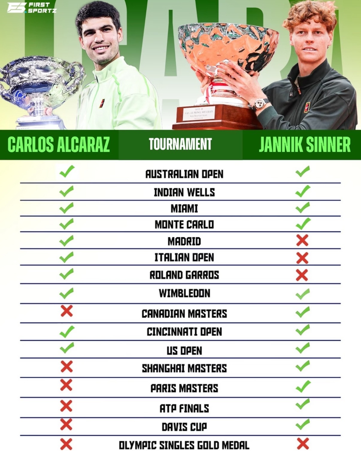 🇮🇹辛纳未夺冠4项:马德里、罗马、法网、奥运金牌。